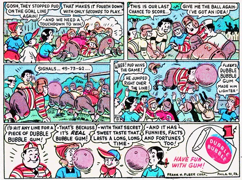 Thompson also drew 'Dubble Bubble Kids' comic strips for advertisements published in comic books. In the final image of those strips, Pud usually told readers that Dubble Bubble is "the best" or "real". Annie promoted the "longer-lasting secret sweet taste", Tim was delighted over the "big bubbles" you could blow with it and Butch reminded children that each comic came with "funnies, facts and fortunes too", referring to a recurring segment in which the readers’ fortune was predicted.