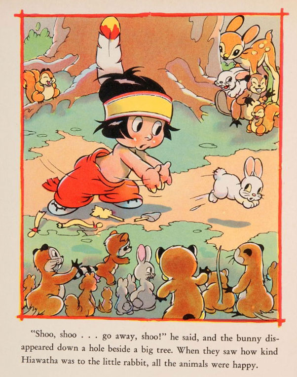 During his time in animation, one of Thorson's most notable designs was the little Native American boy Hiawatha, who starred in Walt Disney's Silly Symphonies cartoon 'Little Hiawatha' (1937), directed by David Hand. The character is presented as the son of the tribe leader of the same name from Henry Wadsworth Longfellow's classic epic poem 'The Song of Hiawatha' (1855). In the cartoon, Hiawatha goes out hunting, but fails to catch any prey. Instead, all the forest animals simply laugh at him. Even when he traps a baby rabbit, Hiawatha takes pity on the bunny and spares his life. Later, the boy is attacked by a huge bear, but in gratitude for sparing their lives, the forest animals help him escape. The same year, a children's book version was released, 'Little Hiawatha' (Wilcox & Follet Co., Chicago, 1937), illustrated by Thorson.