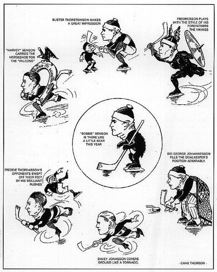 Charles Thorson was born in 1890 in Winnipeg, Manitoba, as Karl Gústaf Stefánsson. His parents were of Icelandic descent and had moved to Winnipeg three years before his birth. His father was active in politics. In 1912, he moved with his family to the town of Gimili, where he became mayor. Thorson's brother, Joseph Thorson, later also gained fame as a politician. Charles Thorson's earliest cartoons ran in the Heimskringla and Logberg, two Icelandic-language newspapers circulating in Winnipeg. He also published political cartoons in The Winnipeg Free Press and the Grain Growers Guide. In between, Thorson designed merchandising promoting the hockey team the Winnipeg Falcons, who won a gold medal at the 1920 Olympic Games in Antwerp, Belgium.
