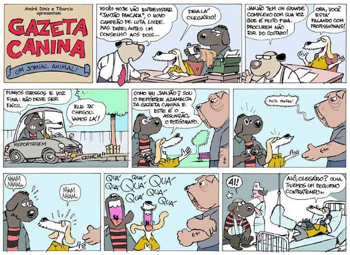'Gazeta Canina'. The reporters have to interview a wrestling champion, but are warned that he has a complex about his voice. Despite claiming they're "professionals", they still burst out laughing when they hear his squeaky vocals. In the final panel, they phone their boss to tell him they had "a little accident."