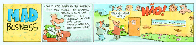'Mad Business'. Translation: "... but the latest washing powder Brilhex makes your clothing soft and free from bacteria. Are you sure you don't want to try our 30-day offer?" - Nudist colony: "For the thousandth time: NO!".