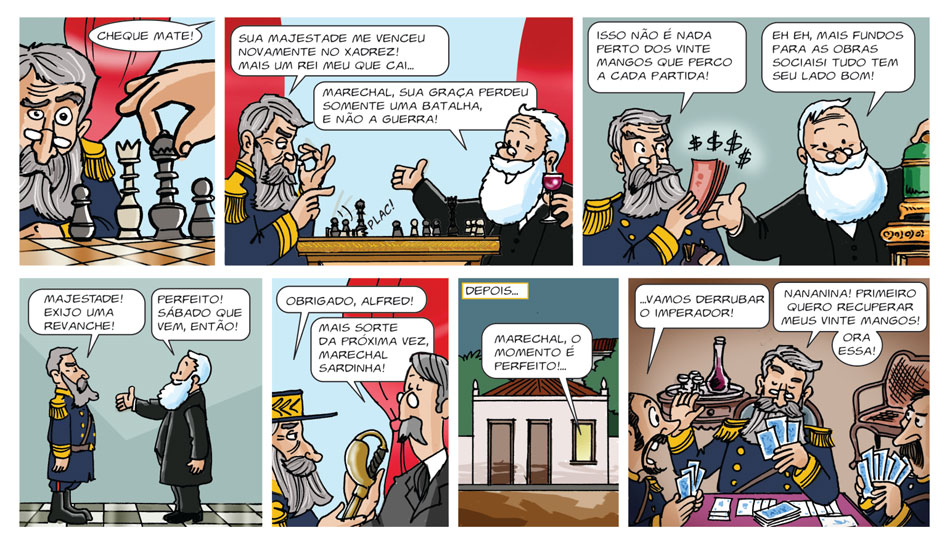 Since the early 2000s, Tiburcio has expanded his work on comic strips. Besides doing comics for companies and instructional manuals, he also began developing his own webcomic projects. An early effort was 'Gazeta Canina', a short-lived humor strip about a newspaper run by dogs, scripted by André Diniz. More enduring were his comic projects about historical and spiritist subjects. In 2011, he began a blog with 'Meu Monarca Favorito' ("My Favorite Monarch", 2011-2019), a humorous webcomic freely inspired by the Second Brazilian Empire under the reign of Pedro II of Brazil. Book collections have been released by Editora Kimera and Super Prumo.