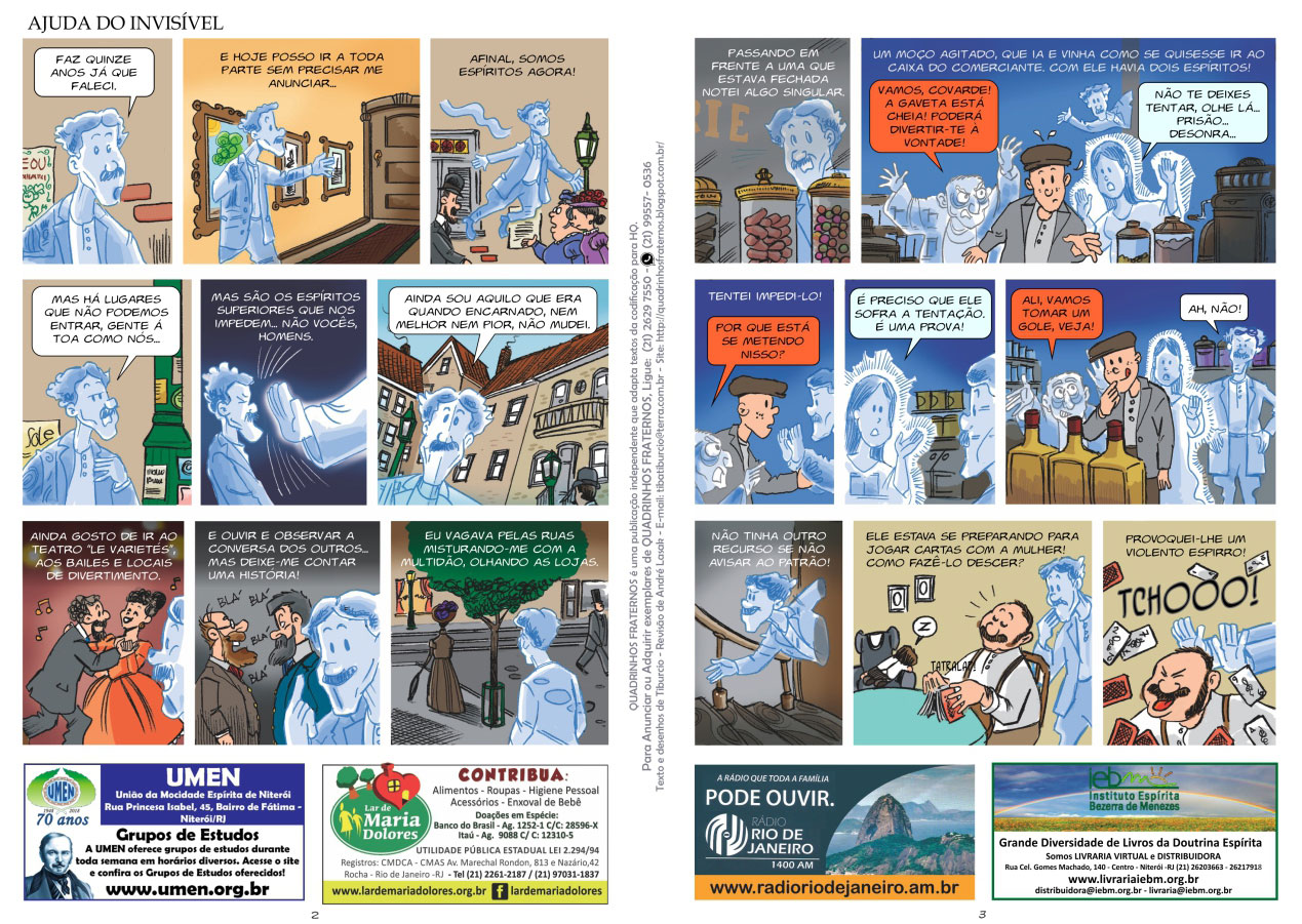 In the meantime, Tiburcio had also begun making works of a spiritist nature. Since 2010, he has been an illustrator for the Jornal Correio Espírita, a magazine sponsored by the Centro Cultural Correio Espírita, aimed at spiritual elevation. One day, he presented his editors a comic book adaptation of an 'Irmão X' story, based on the writings of spiritist medium Chico Xavier. A monthly publication was however halted because of copyright reasons. Instead, Tiburcio turned to writings that were in the public domain, like the books of the 19th-century French author Allan Kardec. This kicked of 'Quadrinhos Fraternos' ("Fraternal Comics", 2017- ), Tiburcio's four-page comic book series that adapts texts from 'The Gospel According to Spiritism' and Kardec's other books from the 'Spiritist Codification' ('The Spirits Book', 'The Book on Mediums', 'Heaven and Hell', 'The Genesis According to Spiritism'). With a print run of 4,000 copies, the semi-monthly series is financed by the sponsors of the Jornal Correio Espírita.