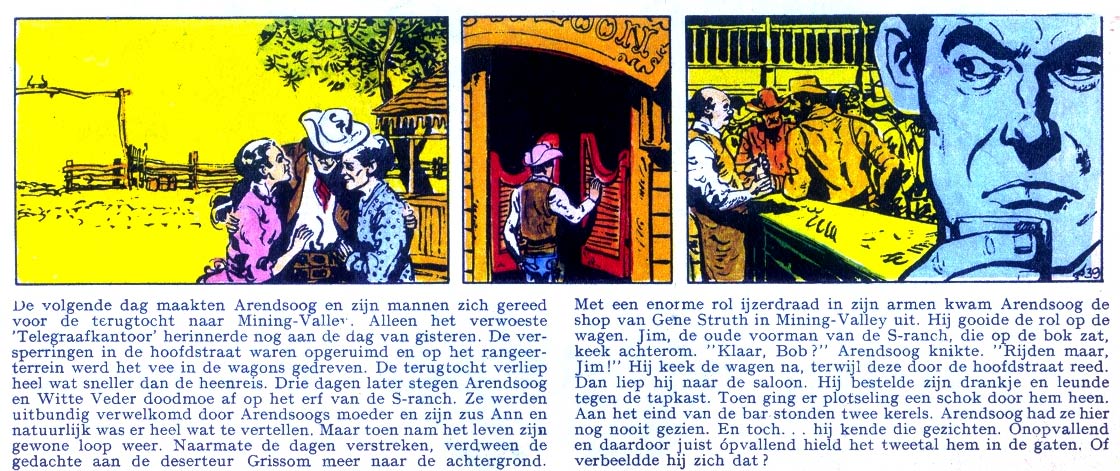 After 'Student Tijloos', Thé left the studios and became a freelance artist. Around this time, he began to expand his activities as an illustrator, although he returned to comics on several occasions. Between 1964 and 1972, he illustrated over 25 text stories by authors like Tim Maran (Anton Schilling), Walter Gerhard and Anton Quintana (Anton Kuyten) for comic magazine Pep, as well as a text comic based on the Far West youth book series 'Arendsoog'. Between 1965 and 1967, four earlier 'Arendsoog' episodes had been serialized in Pep with illustrations by Hans G. Kresse. The next installment, 'De Wraak van Grissom' (1967-1968), was an original story by the series' author Paul Nowee, with sequential illustrations by Thé. The story was later published as the 45th installment in the book series.