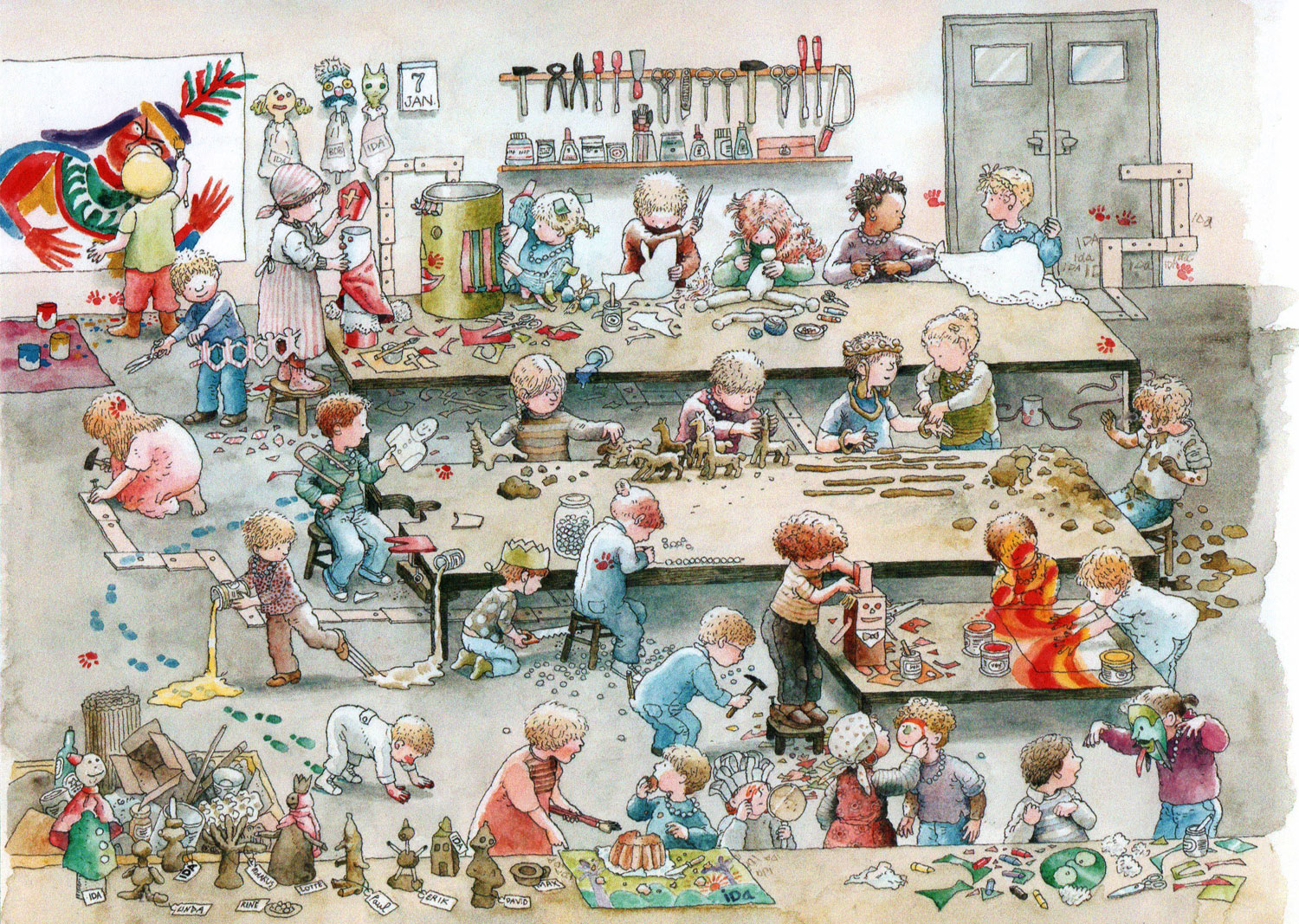 The illustrations for Miep Diekmann's teenage novel 'Total Loss, Weetjewel' (Querido, 1973) marked the artist's full transition towards the field of children's picture books and youth literature. Thé and Diekmann worked again for a series of three nursery rhyme collections, containing 'Wiele Wiele Stap' (1977), 'Stappe Stappe Step' (1979) and 'Ik en Jij Spelen Wij' (1982). As story and art formed a perfect blend, 'Wiele Wiele Stap' was awarded a 1978 "Gouden Griffel" for best children's book and "Gouden Penseel" for best children's book illustration. Also notable was Thé's collaboration with writer Simone Schell, which started at the toddler's magazine Bobo. For many years, they came up with thematic picture spreads showing large groups of children going to a swimming pool, attending a hobby club, performing a school play, etc. Collected by Oberon in the books 'Hier Woon ik', 'Rommel Op Reis', 'Hier Ga Ik Naar Toe' and 'Hier Zit Ik Op', these watercolor pictures were early showcases of Thé's talent for making detailed drawings with large groups, in which every character has its own little storyline. During the 1980s, Thé Tjong-Khing also illustrated some of the children's mystery books by Simone Schell, including 'Tocht naar Toerpa' (1981) and 'Met Andere Ogen' (1982). In addition, the two hosted storytelling sessions at Dutch primary schools.