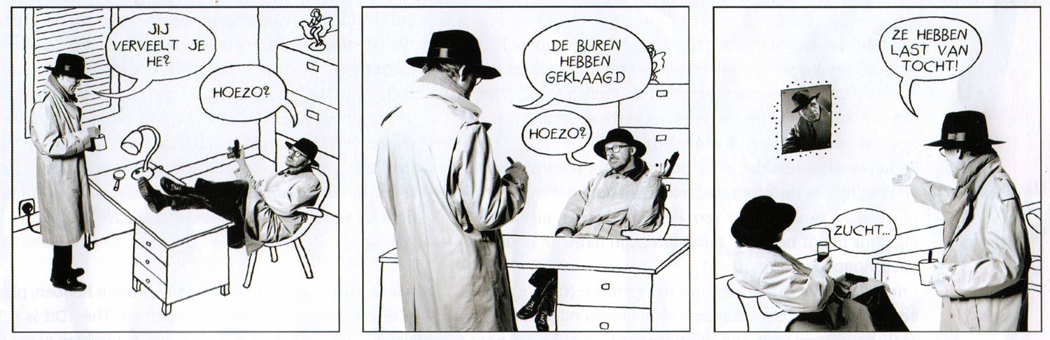 Even well into his eighties, Thé Tjong-Khing returned to comics in 2017. The seemingly tireless illustrator teamed up with photographer Fjodor Buis to create the film noir photo comic 'Crimefighters'. The strip features Thé and Buis as detectives in a drawn environment, much like Hanco Kolk and Peter de Wit's 'Mannetje & Mannetje'. In 2017, the series ran in newspaper Het Parool on a weekly basis. In 2020, Thé was the initiator of a collective comic adaptation by five artists of the dark story 'De Man Die Geen Saxofoon Mocht Spelen' (Personalia, 2020) by novelist Lilian Blom. The other contributors were Aimée de Jongh, Ibrahim R. Ineke, Juliette de Wit and Marloes de Vries.