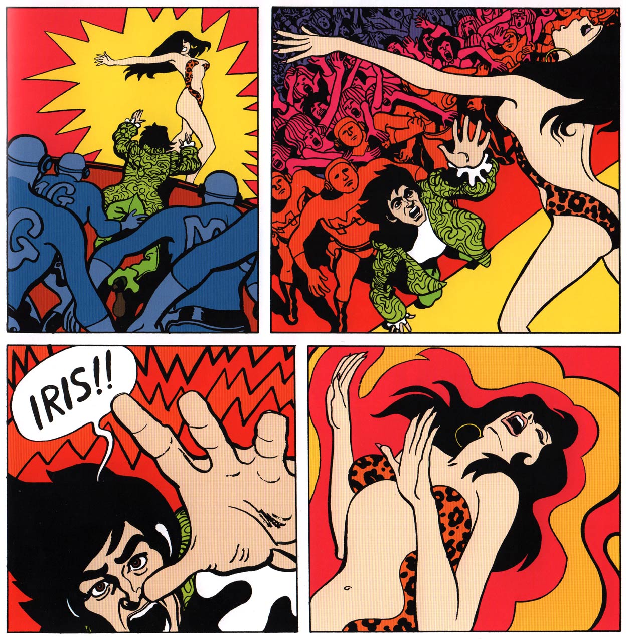 By the late 1960s, Thé had already resumed his working relationship with Lo Hartog van Banda for the colorful and psychedelic album 'Iris' (1968). The book was published by literary publisher De Bezige Bij, and largely inspired by Guy Peellaert's groundbreaking comics 'Les Aventures de Jodelle' (1966) and 'Pravda, La Survireuse' (1967). The story is set in a futuristic Amsterdam, where amusement, casual sex and popstar idolization control everyday life, all orchestrated by a "Dream King". The writer's grim vision of the future is however told from a philosophical and non-political point-of-view, and with Thé Tjong-Khing's swinging pop art panels, the book never becomes too dark. The story is not event-driven, but has an emphasis on emotions and interpretations, told from the perspective of lead characters Iris and Mark. Since the reader follows most events through the female protagonist's eyes, the authors chose to name her Iris. With its philosophical and dreamlike undertone and experimental and erotic graphics, 'Iris' is considered the first Dutch graphic novel. Production was a true joint effort and the story was constructed organically. Thé sometimes deviated from Banda's initial vision, after which the writer alternated the story. In true pop art style, almost all characters were based on celebrities, most notably Iris, who borrowed her initial looks from British cultural icon Twiggy.