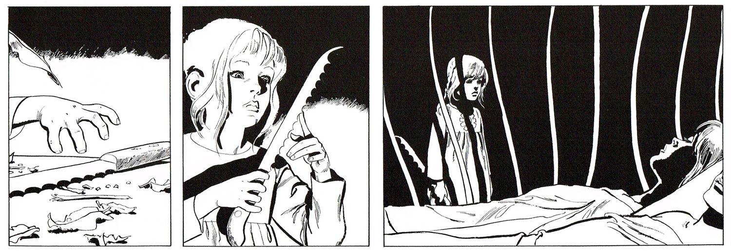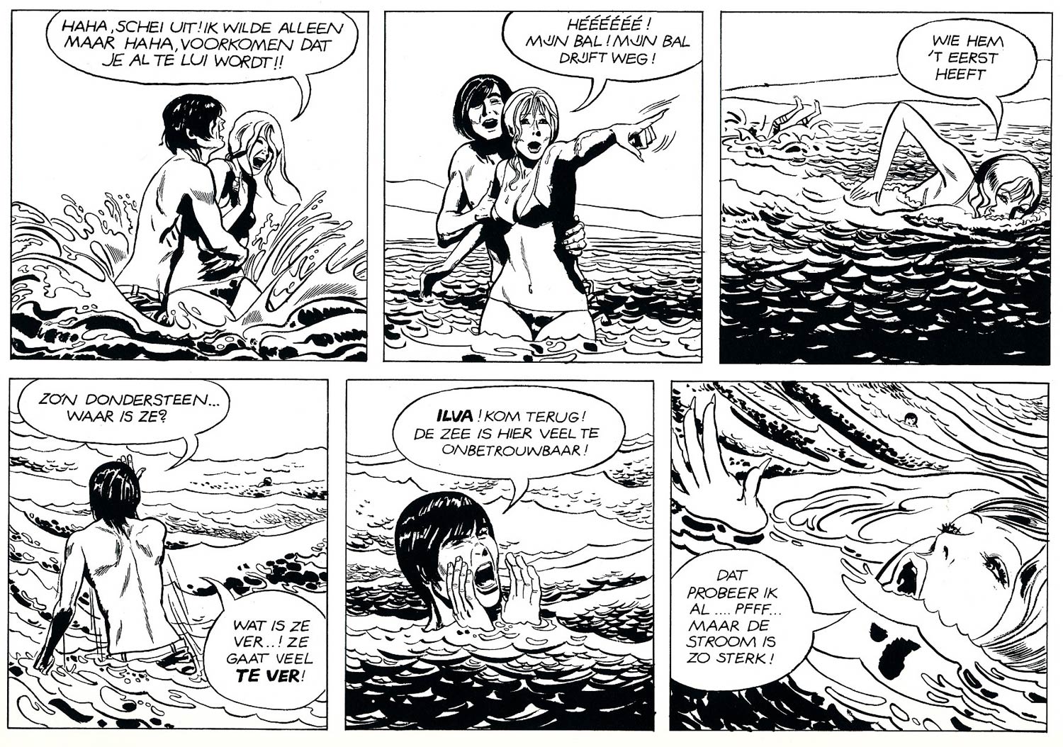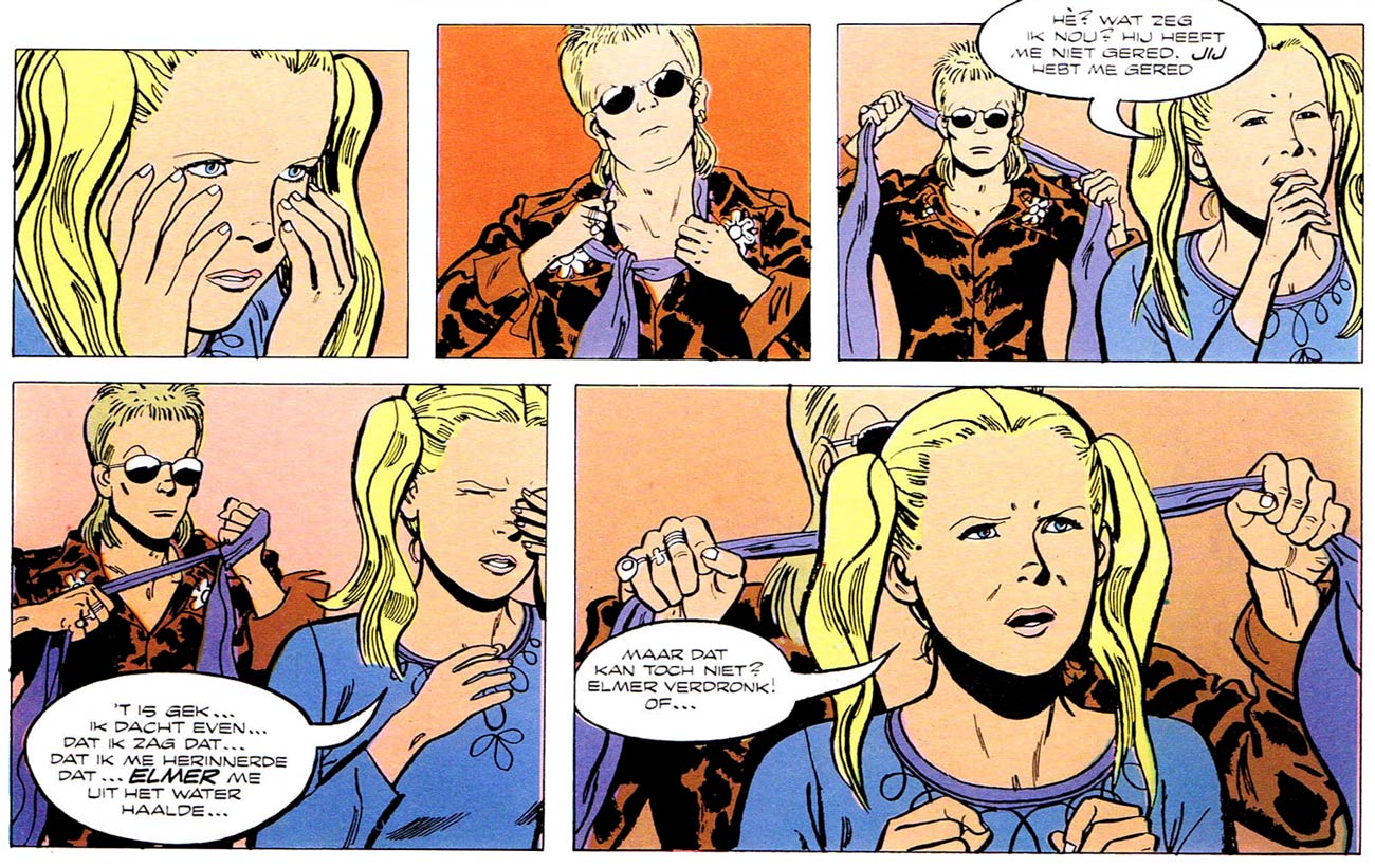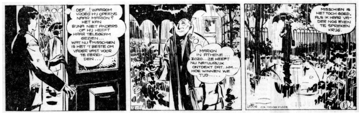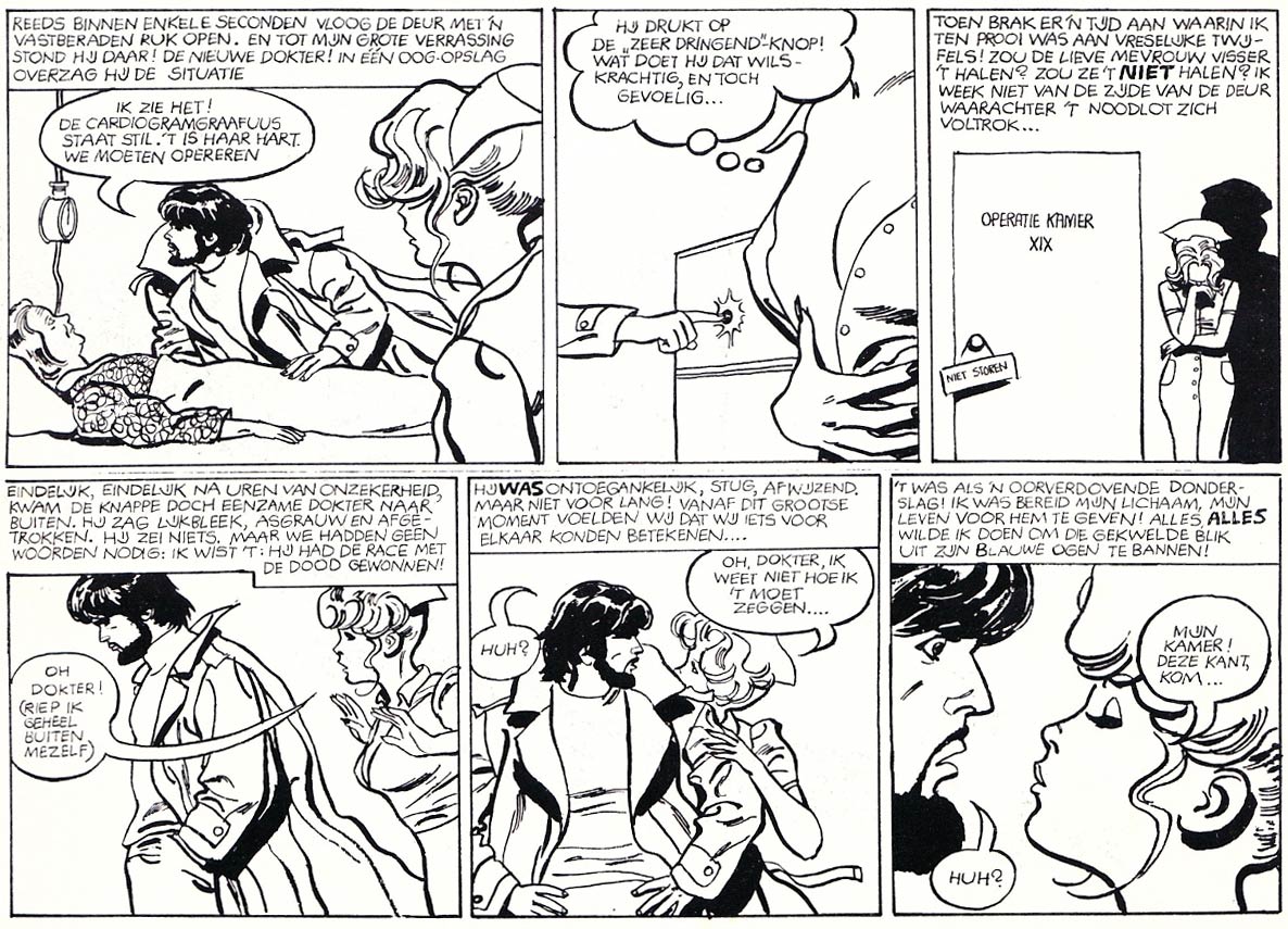 Thé and Lo Hartog van Banda worked together once more, when their thriller story 'De Twee van Oldenhoek' (1975-1976) was published in the girls' magazine Tina. In comparison to Tina's regular melodramatic serials, the story about two twin sisters living with their aunt in the castle of Oldenhoek was far more heavy-handed. Their investigation into a series of break-ins confronts them with a creepy and violent villain. During a strangulation scene, the editors even had to step in to make the story less scary. The original, unaltered scene did appear in the book publication in the 'Tina Topstrip' collection.