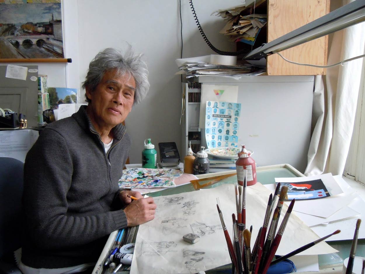 Thé Tjong-Khing is one of the Netherlands' best-known illustrators of children's picture books, but also left his mark on Dutch comic history. His most notable comics were made in collaboration with scriptwriter Lo Hartog van Banda, such as the philosophical newspaper comic 'Student Tijloos' (1960), the pop art-inspired graphic novel 'Iris' (1968) and the futuristic saga 'Arman en Ilva' (1969-1975). 'Iris' in particular was notable as the first graphic novel in Dutch comic history. He has since then illustrated over 300 children's books for top Dutch children's authors, including Miep Diekmann, Els Pelgrom, Burny Bos, Dolf Verroen, Guus Kuijer, Simone Schell, Nannie Kuiper, Annie M. G. Schmidt, Frank Groothof and Bette Westera, as well as a children's Bible edition and fairy tale collections. Thé Tjong-Khing mostly works in a realistically-drawn style. Praised for his virtuosity, clarity and simplicity, Thé tries to find a fitting graphic look and technique for every assignment, with a focus on atmosphere instead of action. He regularly models his characters after movie stars, especially the women, although the illustrator mostly acts as his own mirror model for positions and expressions.