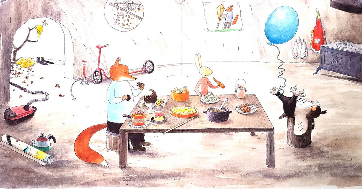 Since 1998, Thé has been working with the Flemish author Sylvia Vanden Heede on a popular picture book series for beginning readers, 'Vos en Haas'. It allowed the illustrator to move from drawing realistic settings towards boundless fantasy, using a colorful cast of forest animals and abstract subject matter. About forty volumes of this award-winning series have appeared at publisher Lannoo, and in 2018 the stories were adapted into a series of 26 short animated films for KRO/NCRV television. After many years drawing in the service of writers, Thé began working on his own picture books. Since 2004, Thé is the author of a series of wordless picture books for publisher Lannoo, starring a family of cake-baking dogs. The books are of an educational nature and urge young readers to search for clues in the richly illustrated spreads. The series includes such books as 'Waar Is De Taart?' (2004), 'Picknick met Taart' (2005) and 'Verjaardag met Taart' (2010). The follow-up 'Kunst met Taart' (2015) introduces its young readers with classic artists like Vincent van Gogh, Piet Mondriaan and Pablo Picasso. Thé also released a children's picture book based on Hieronymus Bosch imagery called 'BOSCH' (2015). Since 2007, Thé Tjong-Khing is also the author of the 'Sprookjesverteller' book series for publisher Gottmer, in which he visualizes classic fairy tales in the way he tells them to his grandchildren. In 2022, he also provided the illustrations for two fairy tale books by the late Godfried Bomans for publisher Sunny Home.