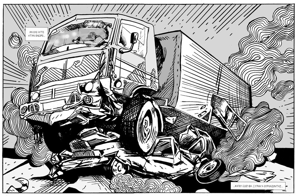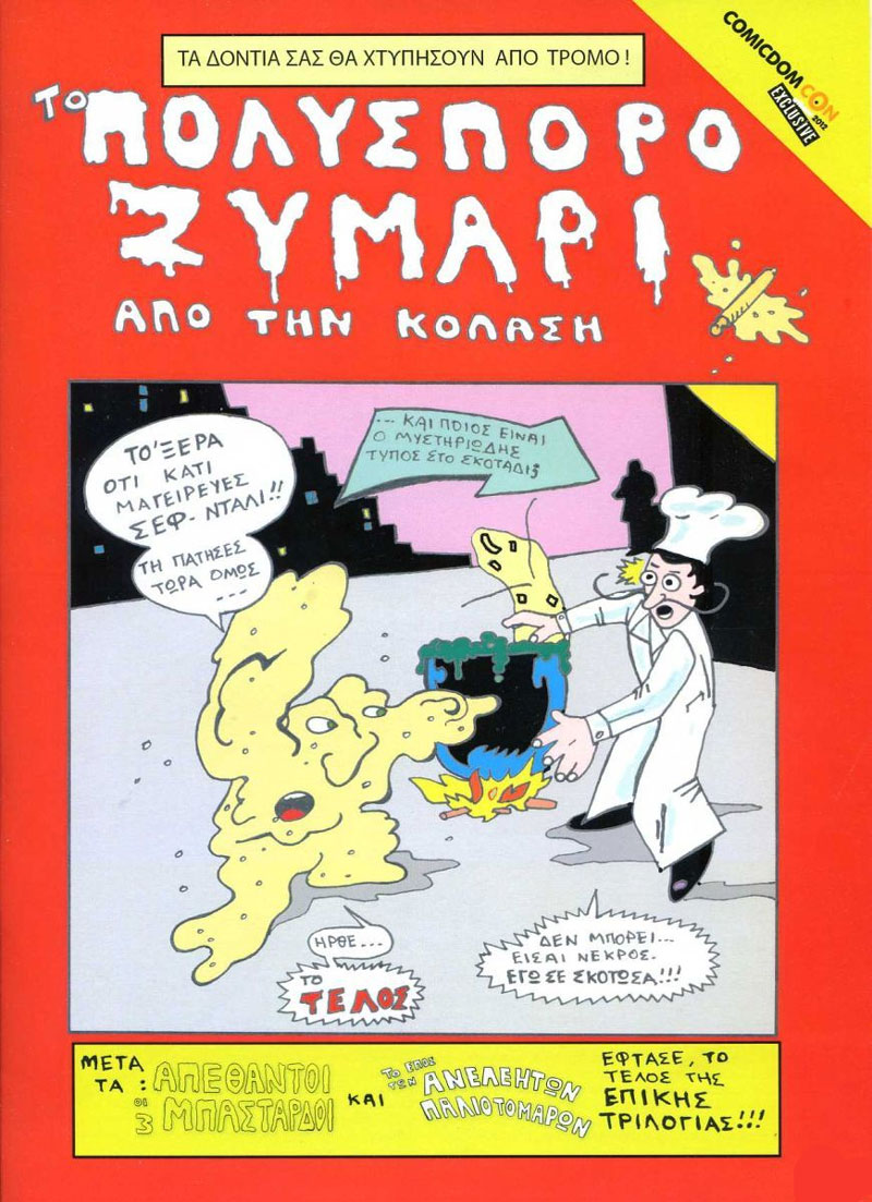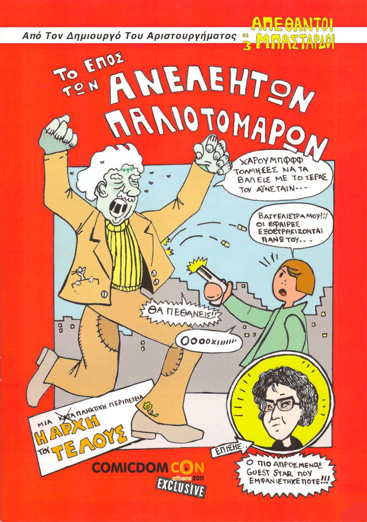 While he has provided the cover illustrations to a variety of comic publications, he created plenty of stories himself. He was one of the artists for Elias Katirtzigianoglou's four-issue supernatural comic book series 'Syndrome' by Comicdom Press, contributing to the third issue in 2009. He also appeared in that publisher's annual 'In Ethria' anthologies between 2014 and 2016. Among his solo publications is the naïvely drawn funny horror comic book trilogy 'The Three Undead Bastards' (Jemma Press, 2010), 'The Epic of the Ruthless Scoundrels' (Comicdom Press, 2011) and 'Multigrain Dough from Hell' (Comicdom Press, 2012), as well as the collection 'Stories to be Discarded' (Kick Me Comics Productions, 2015). He was additionally present in the second 'Evol Tales from the Darkside' anthology by Kampos Publications (2012) and in issues of the cultural magazines Diavazo (ΔΙΑΒΑΖΩ, #531, 2012) and Comic Cultura (#4, 2019). In 2012-2013 his webcomic 'Beyond History' ran on the music website wildthing.gr.