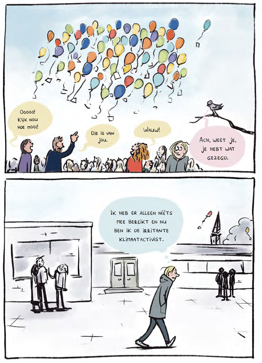 Back in the Netherlands in 2020, Ton settled in Hilversum and continued posting her diary comics on her Substack account. After a successful crowdfunding campaign, her first collection of diary comics from the period 2017-2022 was released in book format, '5500 Miles of Comics' (2023). Over time, Ton began to explore other subjects, like climate change and sustainability. This formed the basis for her next book, 'De Vliegende Klimaatactivist' (Nijgh & Van Ditmar, 2025), which follows her while she tries to find her way in climate activism. This book was meant to inspire and encourage people who want to do something about climate change but don't know where to start.