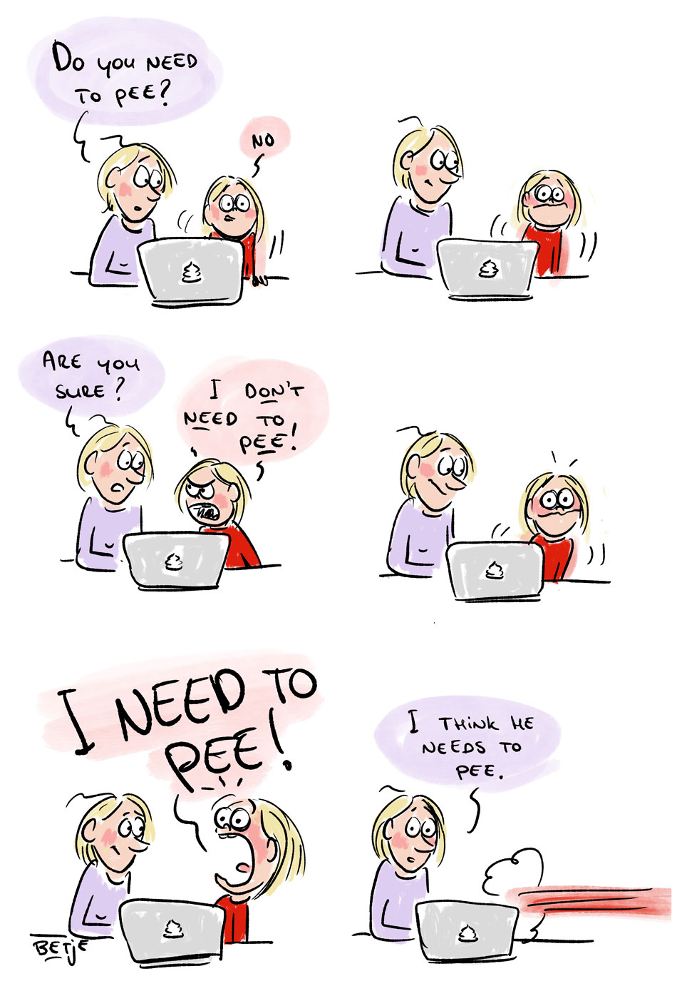 Married to game designer Peter Ton since 2004, the couple first lived in Gouda and then spent five years with their three children in Los Angeles, California. While her husband had his day job with Riot Games, Betje continued to do illustration work, and also discovered the world of autobiographical comics. At the local library, she was inspired by the work of Vanessa Davis, Ellen Forney, David Small, Erika Moen, Jeffrey Brown, Roz Chast, Lucy Knisley and Craig Thompson, while she also enjoyed the work of European comic creators like Barbara Stok, Margreet de Heer and Pénélope Bagieu. While in the USA, she began to chronicle her family life as expats, focusing on the humor in everyday situations.