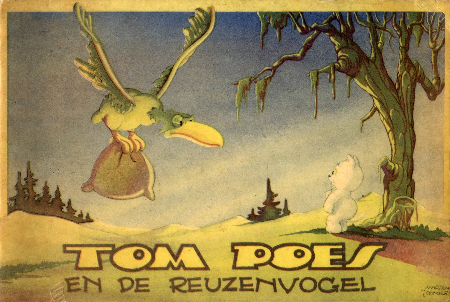 Marten Toonder (often erroneously referred to as "Maarten Toonder") was born in 1912 in the portal city of Rotterdam, South Holland, into a family originating from the eastern Dutch province of Groningen. His father, Marten Toonder Senior (1879-1965), was a sea captain in the Dutch merchant navy and often away from home for long periods of time. Marten's younger brother Jan Gerhard Toonder (1914-1992) would later become a well-known writer and poet. As a child, Marten Toonder was a huge bibliophile, devouring many classic novels and poetry collections, but he also enjoyed the foreign comics his father brought along from his long journeys across the world. During his school years, he got acquainted with the captain's daughter Phiny Dick, who became his girlfriend and eventually his wife. Graduating from secondary trade school in 1931, Marten Toonder wanted to study at the Drawing Academy ("Teekenacademie"), but his father was opposed to the idea. Instead, Toonder Senior brought his 19-year old son along on a sea trip to Argentina, hoping he could encourage Marten for a nautical career. Yet the voyage had the opposite effect. While stationed in Buenos Aires, Toonder met an American animator who once worked for Pat Sullivan and was now a student of the local comic legend Dante Quinterno. The identity of this American is still a source for debate: Toonder always said the man was called Jim Davis, although the only known animator by that name was born in 1915 and would have been sixteen years old at the time. The animator gave the young Marten some drawing tips firsthand, and also introduced him to a written cartooning course by Quinterno. On their way back to the Netherlands, Marten Toonder told his father about his new determination to become a cartoonist. Toonder Senior gave his son an ultimatum: Marten had one year to make a living out of this ambition, otherwise he had to learn a "real" profession.