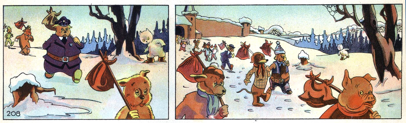 While Toonder is mostly remembered for 'Tom Poes', his longest-running and most widely distributed newspaper strip was 'Panda' (1946-1991). Also a comic with text captions, the main hero is a little panda bear, sent out into the world by his father to learn a trade and earn income. On his journeys, the naïve bear is confronted with many tutors and employers, who are not all that trustworthy. In many ways, the 'Panda' comic was very similar to 'Tom Poes', as it was also set in a fantasy world inhabited by anthropomorphic animals. Panda not only had a similar design as Tom Poes, his butler Jeremias Jollipop strongly echoed Bommel's butler Joost. Panda's nemesis, the sly fox Joris Goedbloed (George Goodfellow), was a crossover character that also made appearances in five 'Tom Poes' stories. One of the most intriguing characters in Toonder's universe, Goedbloed is a villain whose crooked plans often cause trouble for the main characters, but he nevertheless has a sense of decency. If he realizes he went too far, he will help solve the matter and restore the damage done. One particular celebrity fan of Joris Goedbloed was the Irish poet, playwright and novelist Brendan Behan (of 'The Hostage' fame), who was able to quote the character's phrases by heart.