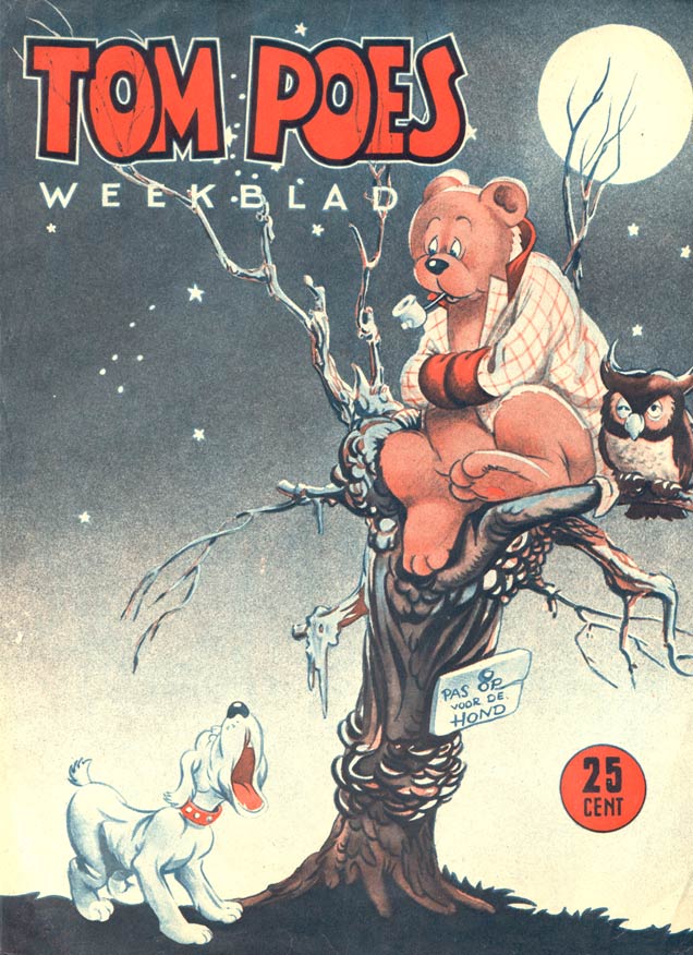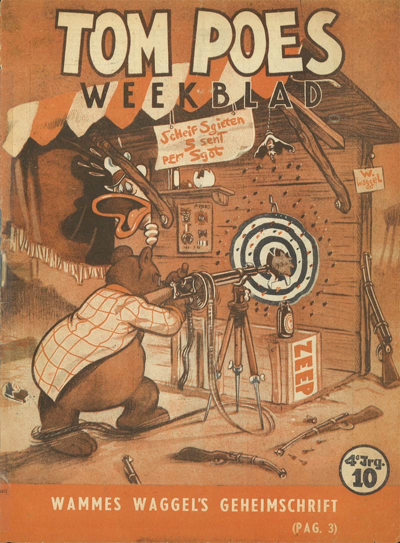 Between 16 March and 18 April 1941, De Telegraaf serialized Toonder's 'De Avonturen van Tom Poes', a story that would later receive the title 'Tom Poes Ontdekt Het Geheim der Blauwe Aarde'. Like most Dutch newspaper comics at the time, 'Tom Poes' was a text comic, with captions printed underneath the images. For the first six episodes, these text captions were written by Toonder's wife Phiny Dick, who also named the character after a popular Dutch pastry, tompouce. Although the series also features human characters, 'Tom Poes' is most of all a funny animal comic. His adventures take place in a fairy tale world, set in an undisclosed time period. In the third story, 'In Den Tovertuin' (12 July-13 August 1941), Tom meets a rich landlord, the bear Olivier B. Bommel (Oliver B. Bumble). The naïve and self-important bear prides himself being a "tender nobleman to whom money doesn't matter". Yet he often gets carried away by his big mouth, because he never thinks before he acts. Although he presents himself as a dignified person, he is usually the first to panic when danger is about and begs Tom "to think up a ploy." His humorous behavior endeared him to readers and he soon became Tom Poes' best friend. In the story 'De Drakenburcht' (1941), Bommel received his signature car, De Schicht. His home became castle Bommelstein, where, from 'De Zieke Hertog' (1942) on, he is served by his loyal labrador butler, Joost. Tom would often visit him there. Although 'Tom Poes' was still a straightforward children's comic during World War II, the stage for its post-war success and increasing higher stature was set.