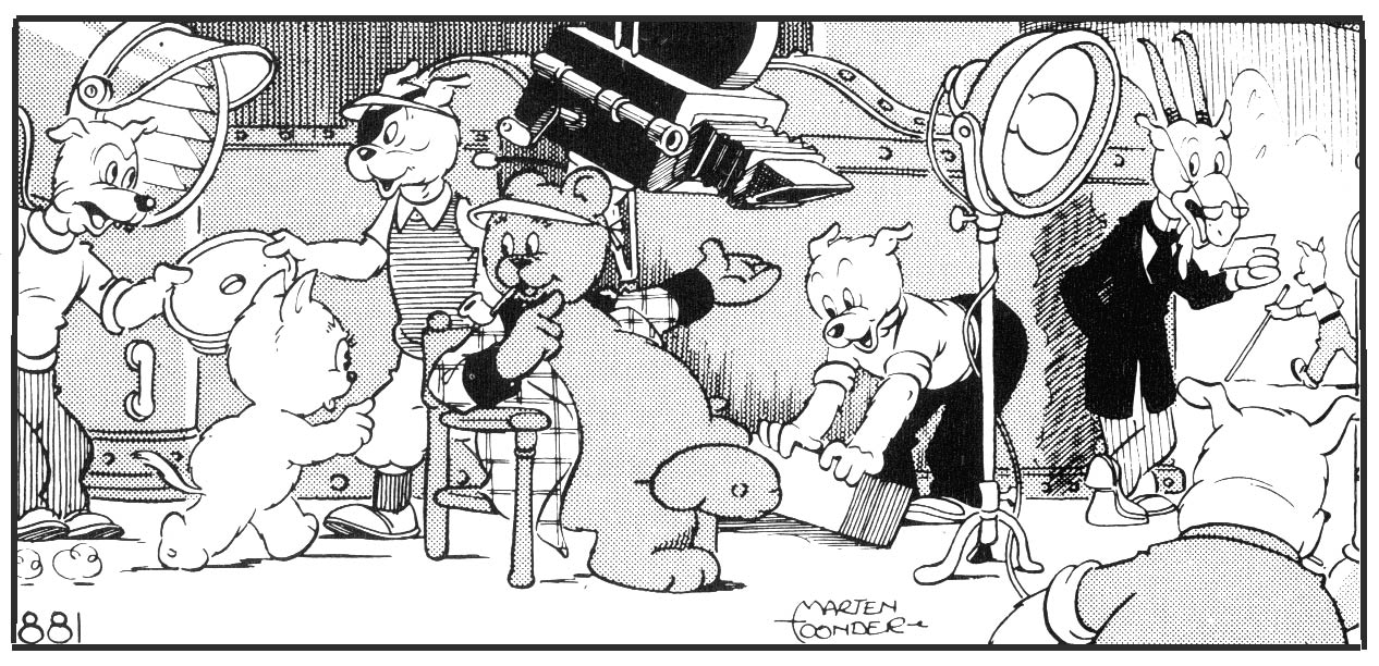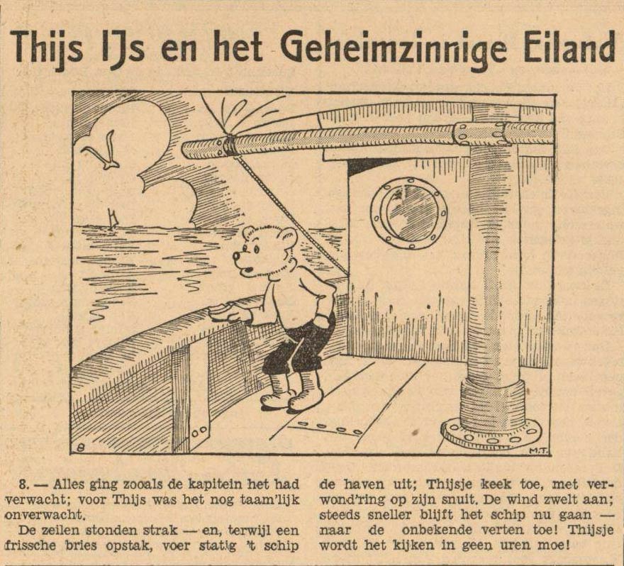 Even though, as a staff artist, Marten Toonder had to work exclusively for the Rotogravure, he created many comic strips on the side. Between March 1934 and October 1938, he and his brother Jan Gerhard made 52 adventures starring the polar bear 'Thijs IJs' for the daily newspaper Nieuwsblad van het Noorden and some other regional newspapers. The 'Thijs IJs' strip was created as a replacement for another white bear, the British 'Rupert' by Mary Tourtel. Because of Marten's employment with the Rotogravure, the comic was initially credited to only Jan Gerhard Toonder, but it was in fact a true family enterprise. While Jan Gerhard did the writing, Marten created the pencil art, after which Phiny Dick provided the inking. As enjoyable as the 'Thijs IJs' stories were, they still show an artist in his formative years. However, elements from these early creations later reappeared in the 'Tom Poes' stories. Some plotlines were reused and the character dynamics between Dicky Dons the cat and the polar bear Thijs IJs already echo Tom Poes and Olivier B. Bommel. Even Bommel's iconic catchphrase, "Een eenvoudige doch voedzame maaltijd" ("A simple but nourishing meal"), was already used in the 'Thijs IJs' comic.