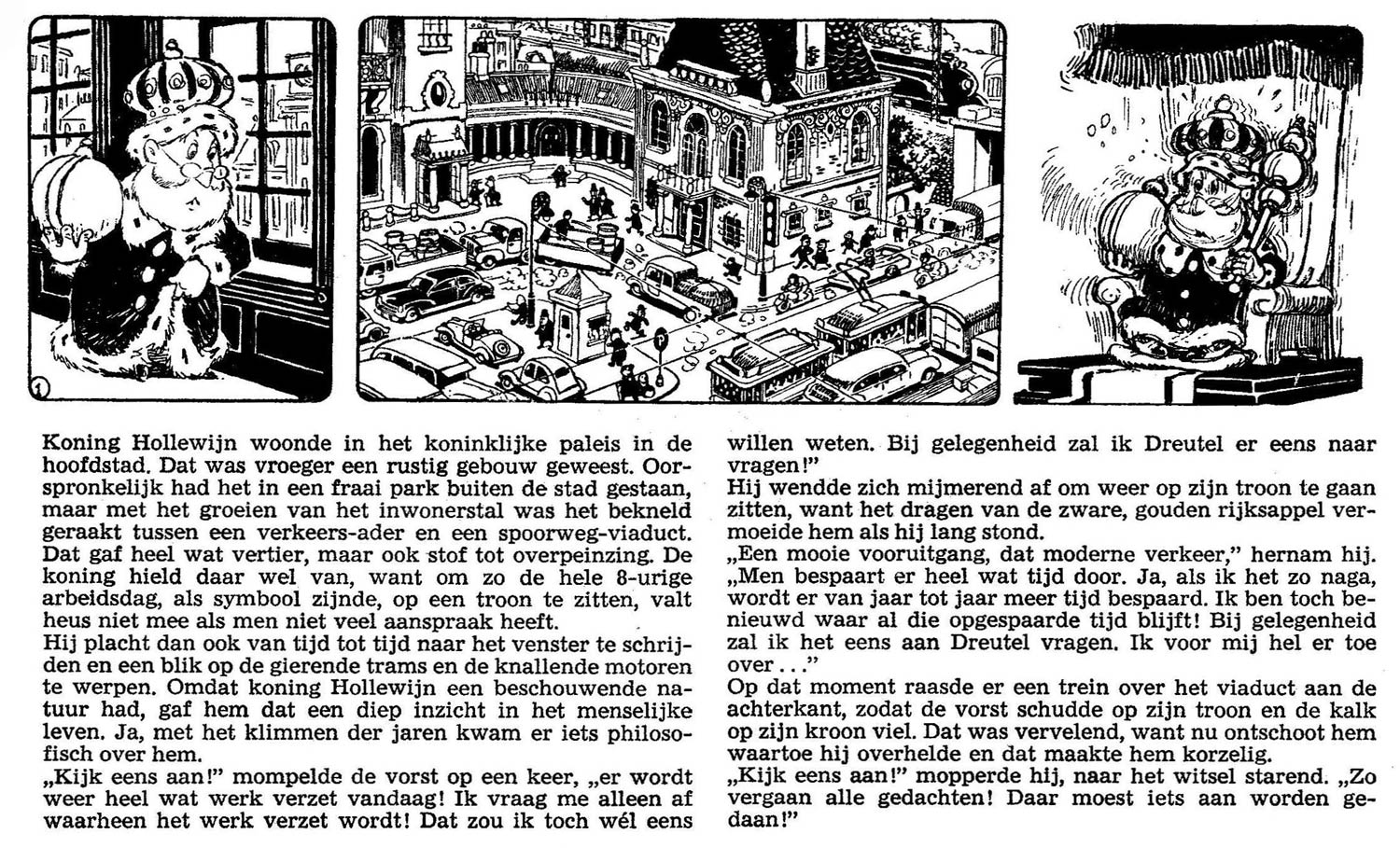 It wasn't until 1954 before the last of the great Toonder series was launched. On 20 March of that year, 'Koning Hollewijn' began serialization in De Telegraaf, the newspaper that had originally run the 'Tom Poes' strip during the war. Because after World War II 'Tom Poes' had moved to De Volkskrant, De Telegraaf asked Toonder to develop a new comic feature of the same caliber. Hollewijn is the wise and cautious monarch of a fictional country, ruling from his palace Koudewater. He is assisted by his impulsive and jumpy secretary Wiebeline Wip. Other dignitaries in the king's court are Prime Minister Dreutel, butler Pieter Plichtpleger, general Hoetentoeter, police inspector Kernslijper, court detective Euvel, court scientist Dr. Kerndrayer and court painter Halbo Hoep. Trouble in the kingdom is usually caused by the shrewd businessman Magnus D. Daalder, the anarchist Zwederik Loser, the criminal couple Alexander and Troubelle Solouche or the witch sisters Anna and Cobra Mork.