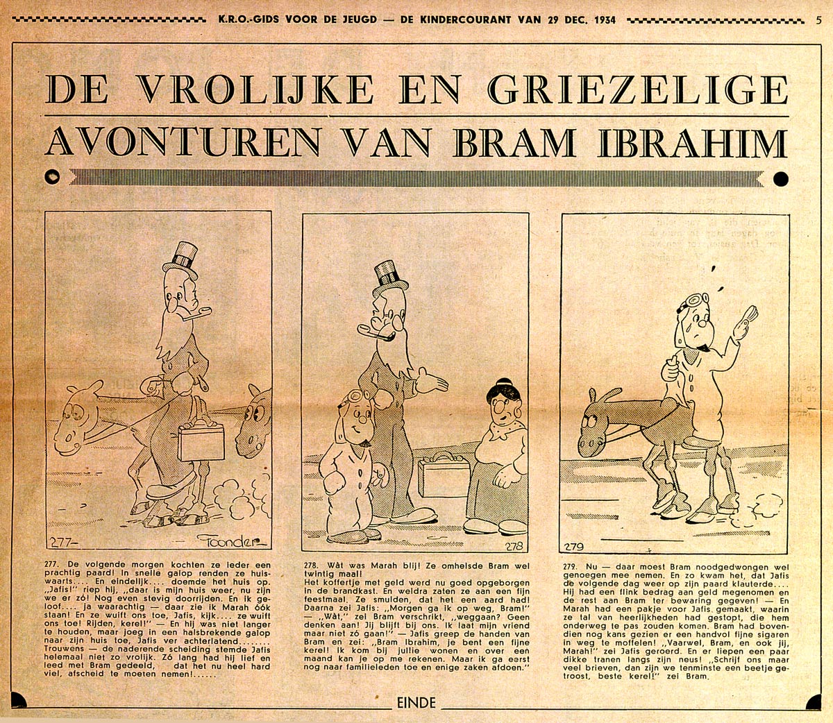 In 1933, Toonder published his first comics, collaborating with his writer brother Jan Gerhard. Between 6 February and 23 June of that year, their comic strip 'Bram's Avonturen' appeared in the children's corner of the Christian newspaper De Nederlander. Written by Jan Gerhard and drawn by Marten for the Vereenigde Persbureaux press agency in The Hague, this adventure comic about an Arab merchant was then syndicated to other newspapers, sometimes under the title 'De Vroolijke en Griezelige Avonturen van Bram Ibrahim' ("The Fun and Scary Adventures of Bram Ibrahim"). Throughout 1933 and 1934, the strip ran in De Zuidwillemsvaart, De Morgen, Nieuwe Hoornsche Courant, De Avondpost, Winschoter Courant and De Zuidwillemsvaart, as well as the weekly K.R.O. Gids voor de Jeugd. Together with a couple of school mates, Marten and Jan Gerhard Toonder additionally ran a short-lived advertising agency, Ibis Studio. By July 1933, Marten Toonder managed to sell his gag strip 'Tobias' to the Helmond publishing company, who ran it in their monthly magazine Ideaal.