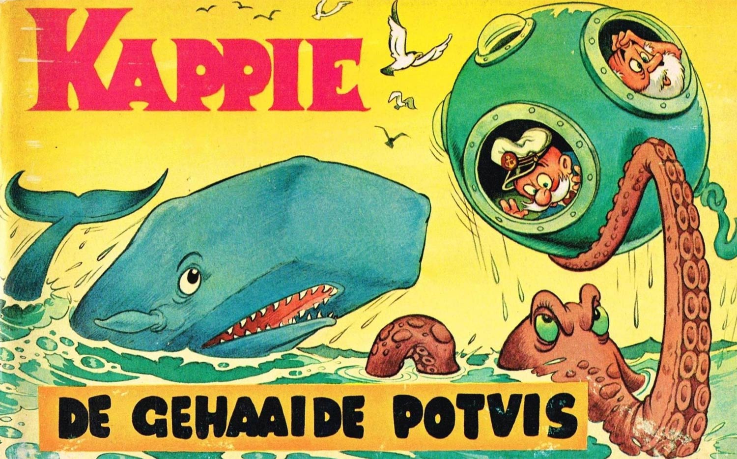 'Kappie'. 'De Gehaaide Potvis'. Cover illustration for a landscape format book.