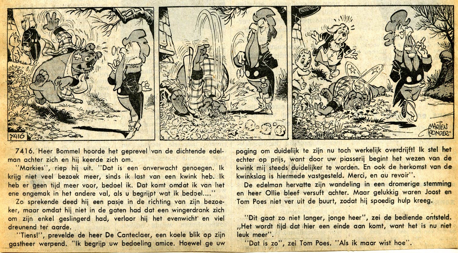 To this day, Toonder's use of language remains unique in Dutch-language comics, to the point that it received the eponym "Toonderiaans" ("Toonderian"). His writing style is instantly recognizable and has often been imitated and parodied. His creative use of words and expressions can even be enjoyed without the accompanying drawings. A rare feat for a comic artist, bringing him on par with the German comic pioneer Wilhelm Busch. Even when his staff did the majority of the production work, Toonder always kept an eye on his texts, making sure they fit his personal literary standards. For every book reprint, the texts were fully revised and amended, if deemed necessary. In 1987 and 1989, two poetry collections by Marten Toonder were published, 'Hanezang' and 'Vleugeljaren', presented as if they were written by the 'Tom Poes' character Marquis de Canteclaer. To learn more about Marten Toonder's linguistic work, Pim Oosterheert's 'Van Aamnaak tot Zwirkvlaai' (2005) and 'Bommelcitaten' (2005) are a welcome addition to any fan's collection.