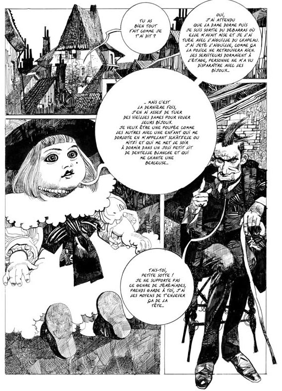 One of Toppi's most remarkable comics is 'Sharaz'de', his comics version of the Arabian Nights. It was originally serialized in Alter Alter in 1979, and later also published in France (Mosquito) and Spain (Planeta DeAgostini). It was in this comic that Toppi played greatly with the graphic design of the page, focusing on the composition of the borders and backgrounds and not too much on the narrative. Although largely in black-and-white, it also features some of Toppi's experiments with direct colors.