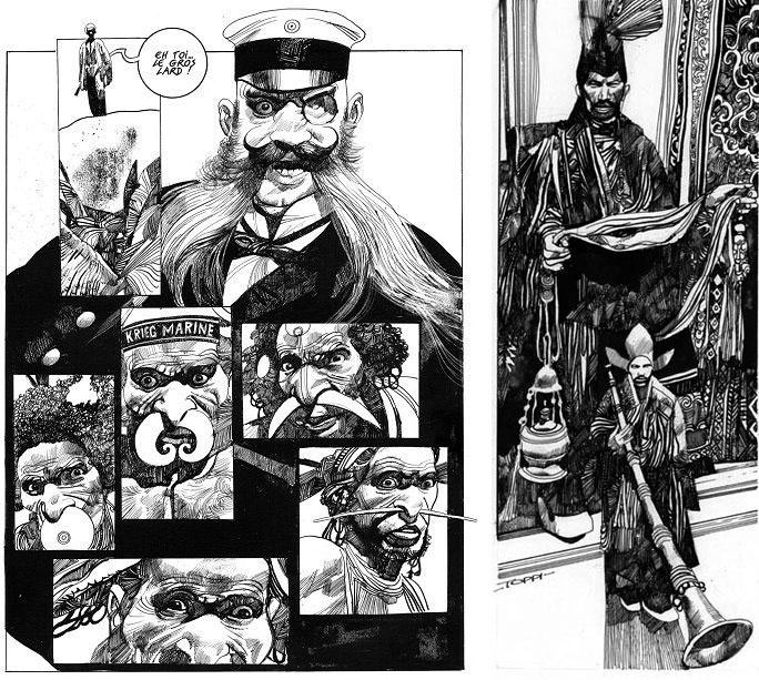 As an allround author, Toppi also produced the eccentric series 'Il Collezionista', as well as comics for L'Eternauta, Comic Art and Orient Express. In the magazine Corto Maltese, he produced features like 'Kas Cey', 'Chapungo', 'M'Felewzi', 'Isola Genile', 'Aloranguay', 'Thanka', 'L'Incontro', 'Una Grave Lacuna', 'Blues', 'Il Dossier Kokombo', 'Solitudinis Morbus', 'Dio Minore' and 'Cavaliere di Ventura', all in the period 1984-1993.