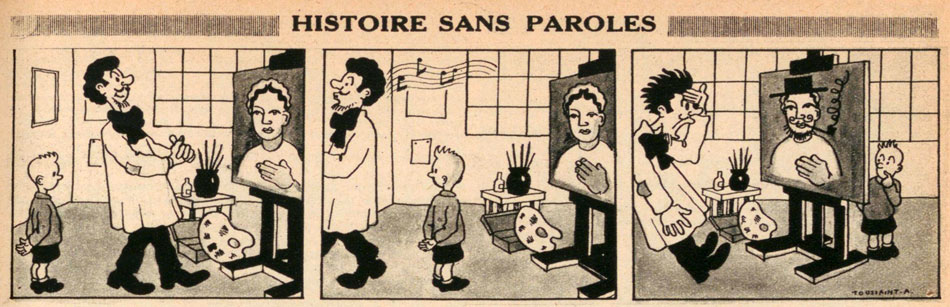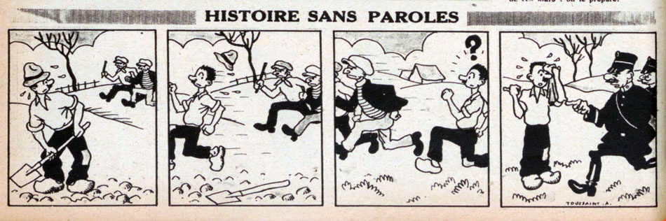 Nothing is known about the identity of the cartoonist behind the signature A. Toussaint. Over the course of 1946, he appeared sporadically in the pages of Grand Coeur, contributing the occasional pantomime gag strip. However, at the time the main provider of this type of strips was François Brouyaux, AKA Saint-Bavard. When the latter's 'Monsieur Zizifus' strips disappeared in late 1946, Toussaint became more prominent. During the 1947 issues, he appeared nearly every week with his 'Histoire Sans Paroles' ("Story Without Dialogue"). However, his tenure was short-lived, as Grand Coeur's final issue appeared on 27 February 1947.