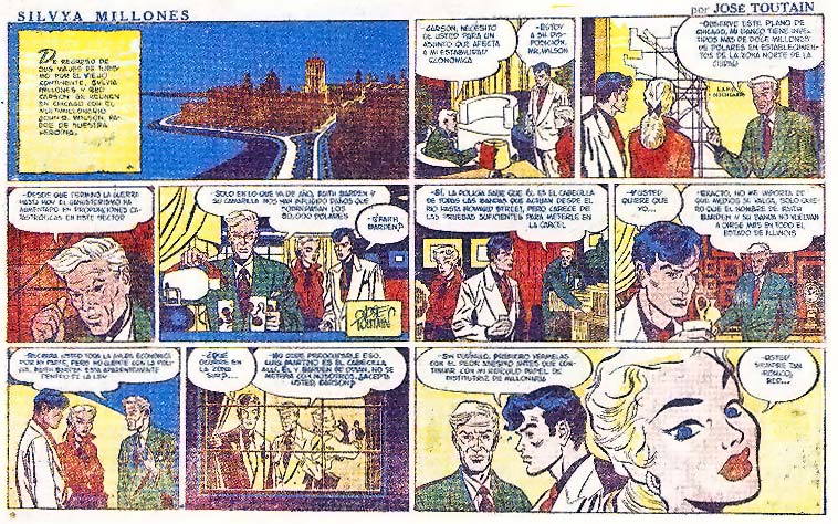 Particularly his work on the exotic comic serial 'El Héroe de Saipán', caught the attention of Francisco de La Fuente, the manager of Histograf, the first Spanish comics syndicate. For Histograf, Toutain first drew the western series 'Un Chico de Arkansas' (1952), before creating his main comic series 'Sylvia Millones' (1953-1955). Appearing in the supplement A Todo Color of the newspaper La Prensa, Sylvia Millones was the first female protagonist in a Spanish adventure/detective comic.