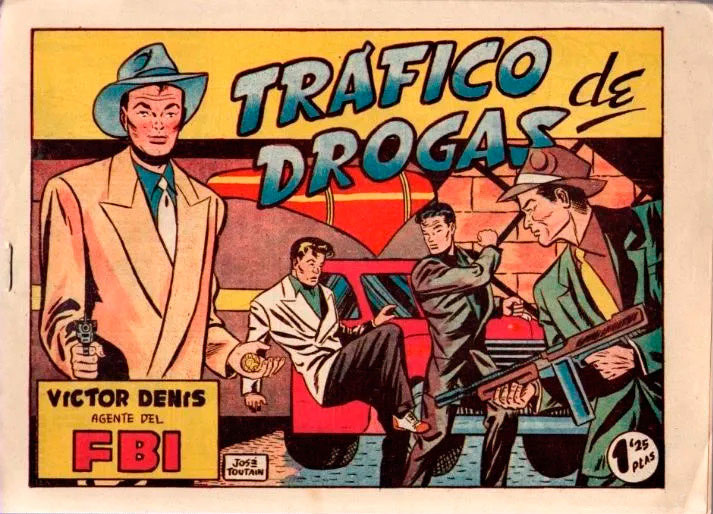 In a style resembling that of Caniff and his contemporary Frank Robbins, Toutain began his professional career as an illustrator at age seventeen. He first appeared in Pocholo magazine of the Hispano Americana publishing house, for which he produced the 'Jimmy' feature (1949). He was subsequently present in the Editorial Cliper magazines El Coyote (drawing the Caniff-like serial 'El Héroe de Saipán', 1950) and Aventurero (with the crime series 'Polito, Chico Moderno'). He also contributed to Cliper's girls' magazine Estrelita (1950) and to Historietas, a magazine edited by F. Goñi, for which he drew the 'Dave Ward' feature. Besides magazines, Toutain also drew issues of adventure comic book series like 'Víctor Denís, Agente del FBI' of Ediciones Toray (1950), 'Hazañas de Guerra' of De Haro (1951) and 'Héroes Bíblicos' of Ediciones Domingo Savio (1956).