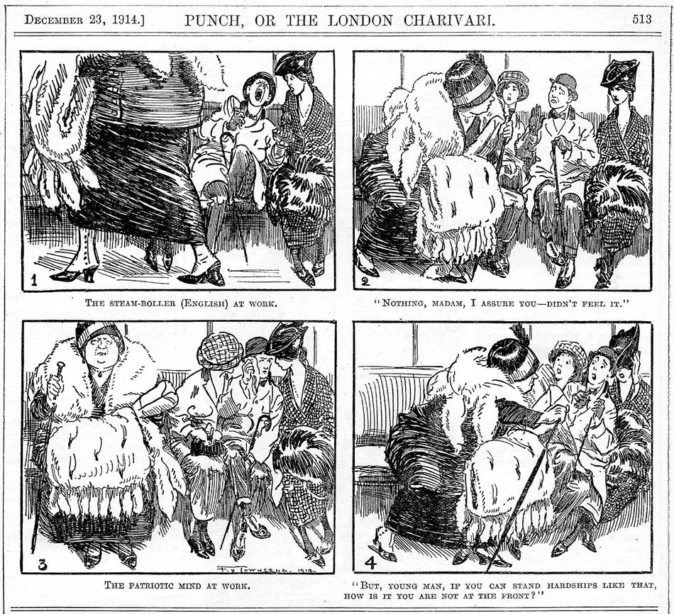 In 1896, Townsend joined the popular and influential British cartoon magazine Punch. In 1905, he became their very first art editor. As a cartoonist, he was responsible for the 'Parliamentary Sketches' column, a series of cartoons which ridiculed politicians in the London Parliament.On 23 December 1914, Townsend made a four-panel text comic for Punch promoting the draft. The comic strip takes place in a train or a streetcar. We see a majestic woman accidentally stepping on a young man's foot. He screams in pain, yet afterwards politely denies that he felt anything . At first, the woman seems to think nothing of it, but after a moment's pause she asks him rather aggressively why he isn't at the front, if he can stand pain like that.