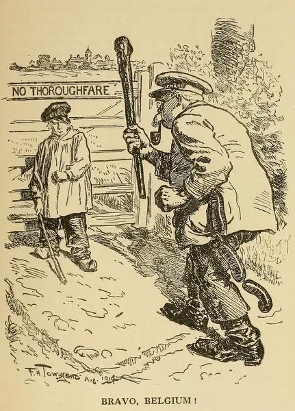 Townsend's most famous cartoon for Punch is 'No Thoroughfare', better known under its caption "Bravo, Belgium" (12 August 1914). The cartoon shows an old man with sausages and a big stick (Germany) threatening a little boy (Belgium) defending a fence. It alludes to the German invasion of Belgium during the then ongoing First World War. Much to the Germans' surprise and the English' admiration, the Belgian army managed to fend off the German soldiers far longer than they'd anticipated. They even kept part of their country behind the river Yser (IJzer) free from occupation during the entire war. In 1933, another Punch cartoonist, George Morrow, paid tribute to Towsend's iconic cartoon by making Austria the little boy and Hitler the man with the huge stick. Over the decades, the term 'Bravo, Belgium!' became synonymous with Belgium's resistance against the German invaders during the First World War, sometimes misquoted as 'Bravo Little Belgium' or 'Brave Little Belgium'.