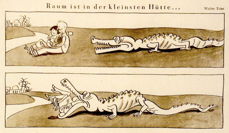 Trier's work heavily opposed the Nazi government and by 1936, he and his family were forced to flee to England. He continued to provide anti-Nazi artwork for the British Ministry of Information during World War II. In England, he also began a longtime association with the small-format monthly humour magazine Lilliput, for which he designed the front cover from the first issue in 1937 until 1949. Trier moved to Canada in 1947, where he made illustrations for the company Canada Packers. He passed away in 1951 in Craigleith, near Collingwood, Ontario, from a heart attack.
