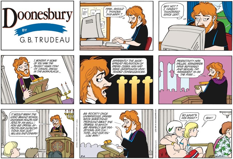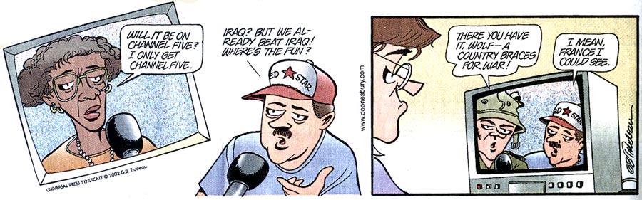 Garry Trudeau is one of the main political and humanitarian artists of the last three decades. He was born in 1948 as Garretson Beekman Trudeau in New York City in 1948, and raised in Saranac Lake. Among his graphic influences are Jules Feiffer and William Hogarth. Later in life Trudeau also expressed admiration for Keith Knight. He attended Yale University, and was a cartoonist and writer for The Yale Record. He also organized several cultural events during this time with the Record, and he was a member of Yale's secret Scroll and Key society. He also created a comic strip called 'Bull Tales', that moved to the Yale Daily News in 1969. Universal Press Syndicate bought the strip and started selling it nationwide to over 400 newspapers under the title 'Doonesbury'. The first episode of the daily comic was published on 26 October 1970, while the first Sunday comic appeared on 21 March 1971.