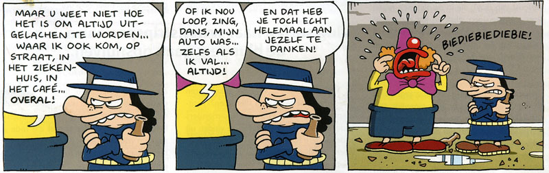'Mevrouw De Heks'. Translation: "But you don't know what it's like to always be laughed at... wherever I go, in the street, the hospital, the bar... everywhere! Whether I walk, sing, dance, wash my car... even when I fall... always!" - "And yet you owe it all to yourself!".