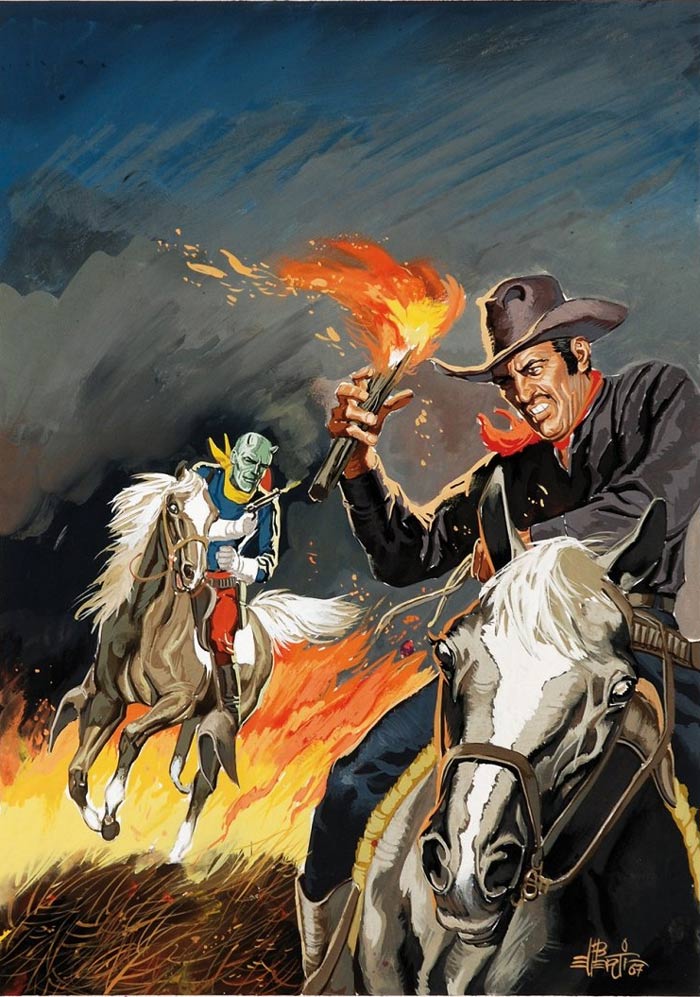 Uberti worked with writer/publisher/artist Pini Segna on series like 'Indian Kid' and 'Fiamme alla Frontiera' in the period 1954-1957 and began his collaboration with the publisher Bonelli in 1957. He drew the wild west series 'Kociss' (1957-1958) from scripts by Gian Luigi Bonelli for the collection Audace, and 'Hondo' for the collection Zenit. He also provided art to many installments in the collection Albi dell'Intrepido of Cino and Domenico Del Duca's publishing house Universo, starting with 'L'Usurpatore' (issue 391) in 1953, and then several more in 1958-1959.