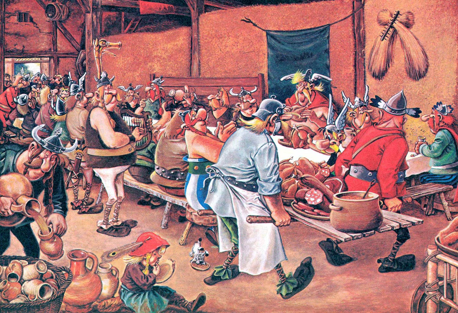 Parody of Pieter Bruegel's 'The Peasant Wedding', from 'Astérix Chez les Belges'.