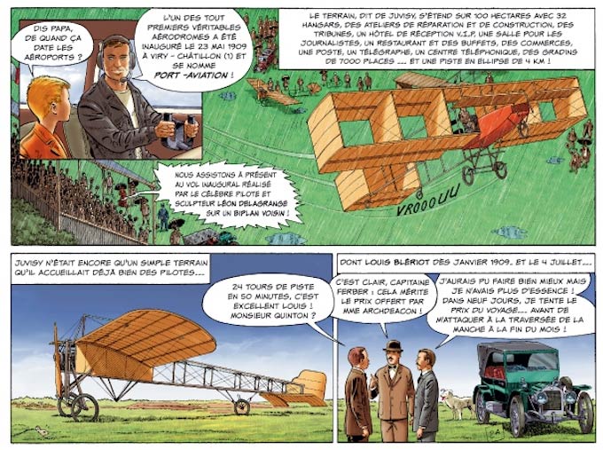 From 2009 on, Marcel Uderzo was a regular artist for several aviation books by Éric Stoffel and Franck Coste at the publishing house Idées+. These included the first installments of the educational series 'L'Histoire de l'Aéronautique' ("The History of Aeronautics"), dealing with aviator Louis Blériot ('Des Origines à Blériot', 2009) and the pioneer years of French aviation ('1909, l'Année de Tous les Défis', 2010). The latter was drawn in collaboration with Frédéric Allali. Uderzo also made contributions to the publisher's collective series 'Histoires de Pilotes' (2010-2015) and 'Patrouilles Aériennes Acrobatiques' (2011-2014). One of them was a comic biography of Charles Lindbergh, made with scriptwriter Francis Bergèse (Idées+, 2015). Between 2018 and 2020, he was among the illustrators of the publisher's landscape-format books about classic cars and motorcycles. Idées+ additionally reprinted Uderzo's old 'Mathias' stories and released the artbook 'Les Pin-Up de Marcel Uderzo' (2012), a collection of 16 pin-up illustrations.
