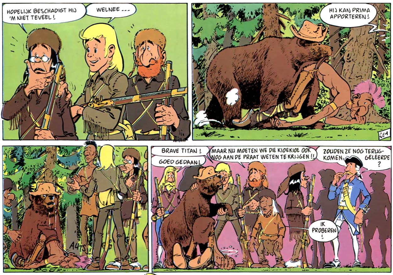Marcel Uderzo's best-known solo work were the three books of 'Les Mémoires de Mathias' (1981-1985), which he made with writer Moloch (Michel Clatigny) for the publishing house Delachaux & Niestlé. Mathias is an elderly Norman, who tells the local children about his adventures in the French-Canadian plains in the 1750s. The stories follow the younger Mathias during his adventures with Native Americans, trappers and lumberjacks against the setting of the French-Native American War. Matthias is always accompanied by his bear Titan, whom he had adopted as a cub after his mother was shot. In the 2010s, reprints of 'Les Mémoires de Mathias' were released by Idées+.