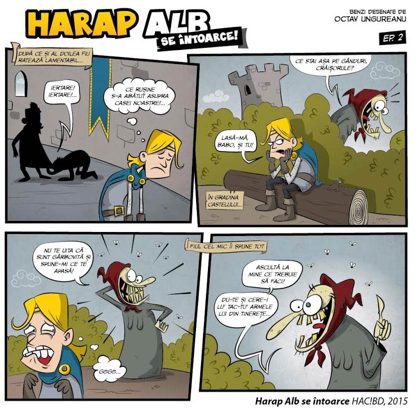 Ungureanu's next comic series was 'Harap Alb se intoarce', published in the Romanian comic magazine HAC! (also published by HAC!BD), where Octav worked as a storyboard artist and contributing editor until 2015. Other long-term colaborations include children's magazines Scoala De Basm and Amintiri Din Copilarie, for which he illustrated many comic pages, games and puzzles.