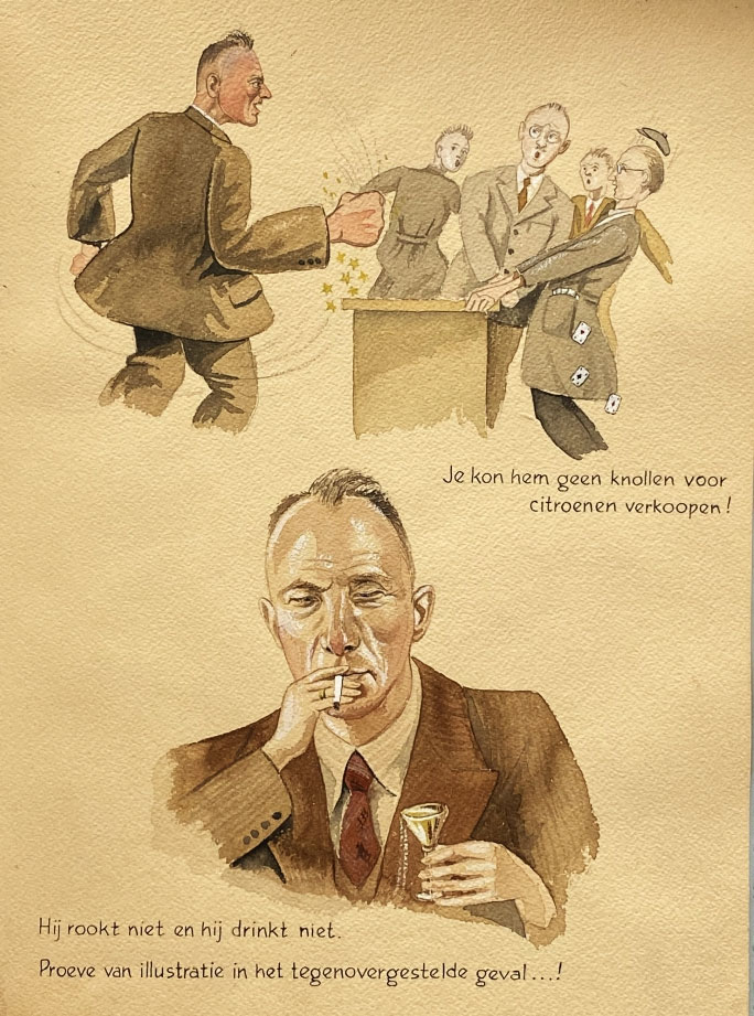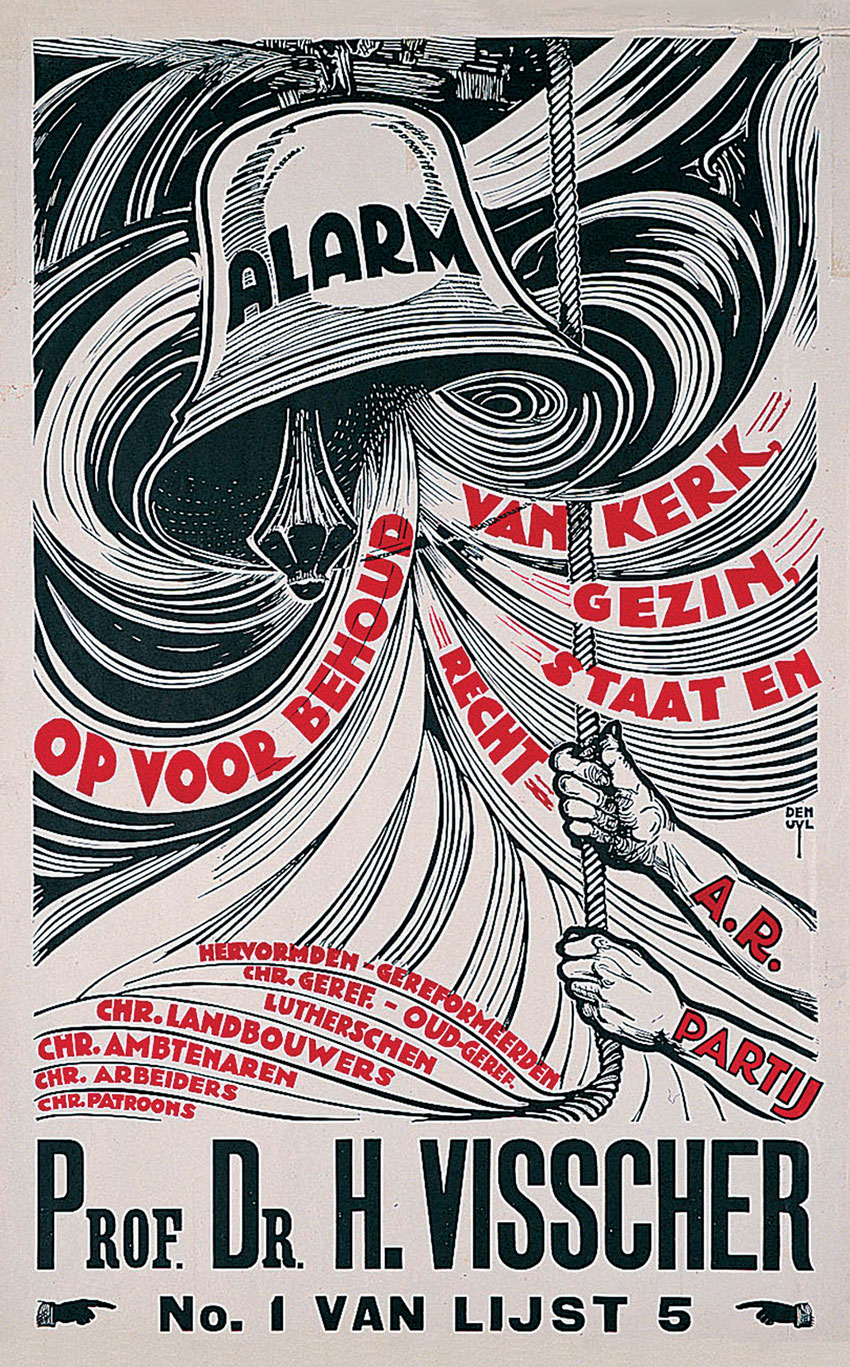 Almost nothing is known about the artist Willem den Uyl (officially, his name was spelled as "Willem den Uijl"). He was a relative of Joop den Uyl (1919-1987), the future party leader of the Dutch socialist party PvdA and the Dutch Prime Minister in the period 1973-1977. In the years prior to World War II, Willem den Uyl was affiliated with the Dutch Christian democratic anti-revolutionary party ARP. For the 1929 elections, during which the ARP had no less than twelve party leaders, Den Uyl designed the election posters. Only the one with the name of Prof. Dr. H. Visscher has been preserved. Den Uyl was also affiliated with the party newspaper De Standaard and its printeries Drukkerij De Standaard and Drukkerij Holland N.V. In 1943, he provided the illustrations for the commemorative book dedicated to the 25 years of loyal service of director Albert Jongman, 'Albert Jongman 18 November 1918-1943'.