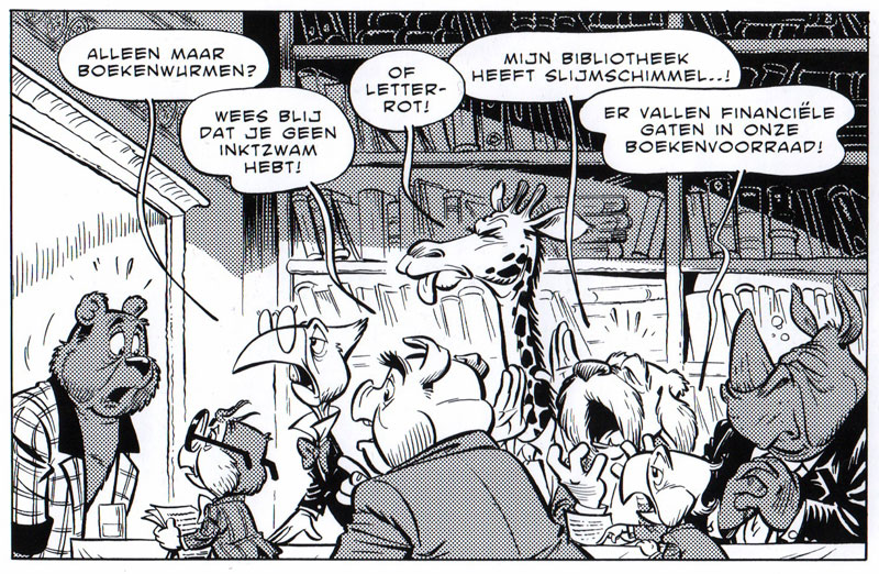 Around 2010, the Toonder Compagnie was exploring the possibilities of creating new comics with 'Tom Poes en Heer Bommel', the iconic creations of Dutch comic author Marten Toonder (1912-2005). Preliminary talks were held with Eric Hercules and Daan Jippes and Valkema. In 2012, it was announced that in case of a revival of the original newspaper comic, Valkema would be the artist. So far, he has only drawn the special edition episode 'Tom Poes en de i-Padden' (NVB, 2012), written by Patty Klein at the occasion of the 100th anniversary of the Dutch Association for Professionals in the Library, Information and Knowledge Sector (NVB). In that same year, Valkema was one of the participating artists of the collective recreation of the standout story 'Bommel en de Bovenbazen', serialized in NRC Handelsblad between 2 May through 21 September 2012. In subsequent years, new 'Tom Poes' balloon comics and children's books have been illustrated by Tim Artz and Henrieke Goorhuis, but it never came to a full-blown return of the classic black-and-white newspaper strip.