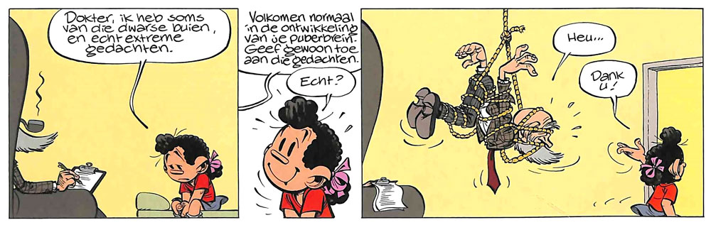 'Elsje'. Translation: "Doctor, I sometimes have contrary tempers and real extreme thoughts." - "Completely normal in the development of your puberty brain. Just give in to these thoughts." - "Really?" - "Uh..." - "Thank you!".