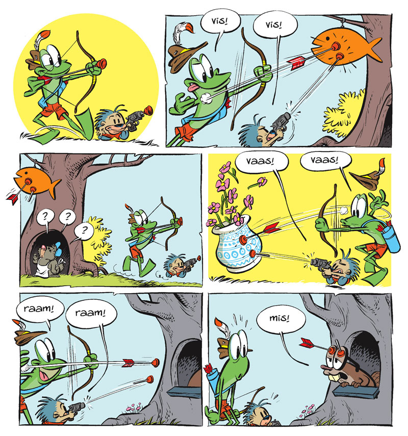 Shortly before the launch of 'Elsje', Gerben Valkema began a collaboration with the educational publishing house Zwijsen. Still signing with "Gurby", his first creation was the little boy 'Tommie' (2006), whose unlucky adventures appeared as gags and comic strips in the children's magazine Roetsj. Subsequently, Valkema created the playful frog 'Kik' and his funny animal friends for the back page of the children's magazine Maan Roos Vis. The magazine aims at children in "Group 3" of the Dutch primary school system (First Grade to Americans), so the texts follow the progression of beginning readers according to the Dutch AVI learning method. Simultaneously, Valkema's former Studio Jan Kruis colleague Michiel van de Vijver launched his 'Joep' comic in Roetsj, a magazine for children in "Group 4" (Second Grade).