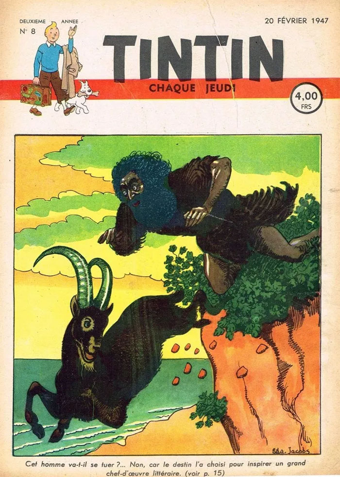 Cover illustrated for Tintin #8 (20 February 1947) by Jacques Van Melkebeke, but signed with "Edg. Jacobs".