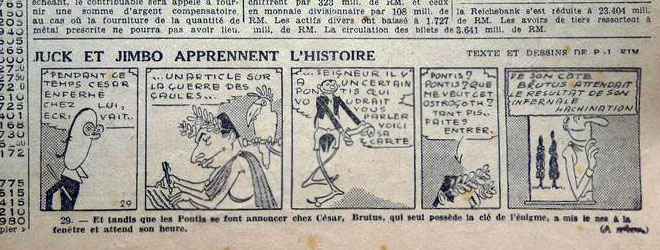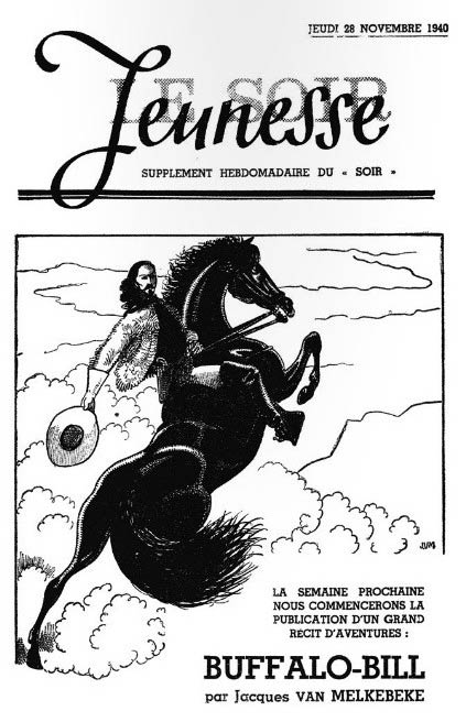Van Melkebeke continued to work as an editor for Le Soir, after the discontinuation of its youth supplement. In January-February 1943, he illustrated the comic strip 'Juck et Jimbo Explorent l'Histoire' ("Juck and Jimbo Explore History"), which appeared in the interlude between the 'Tintin' episodes 'Le Secret de la Licorne' ('The Secret of the Unicorn') and 'Le Trésor de Rackham le Rouge' ('Red Rackham's Treasure'). 'Juck et Jimbo' was created with writer Paul Kinnet (pen name of Paul Maury) under the joint signature J.-P. Kime. The comic had an educational purpose, teaching young readers about history.