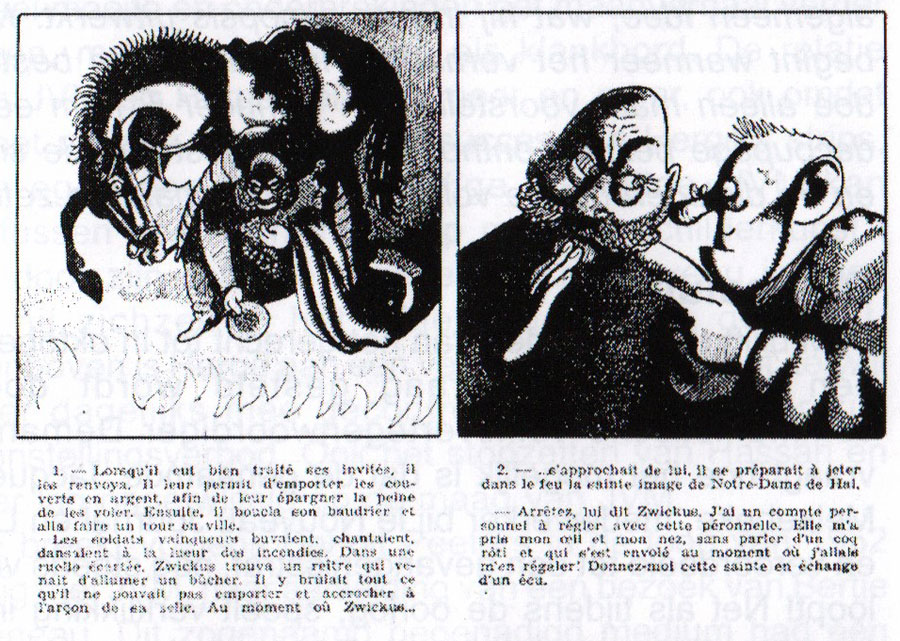 On 9 November 1943, a Belgian resistance group managed to sabotage the delivery of that day's edition of Le Soir and distribute several copies of a fake edition to various stores in Brussels. It looked like a real issue of Le Soir, but was in fact a carefully crafted parody, full with ridiculous articles which mocked the war situation and the Nazis. People who bought an issue of Le Soir that day were pleasantly surprised and amused by this clever hoax. The makers had even included a parody of Van Melkebeke's comic strip 'Les Aventures de Baron de Crac'. In this version, the baron is a caricature of Hitler, overpowered by a Russian bear in the tundra. He manages to flee but runs right into the arms of a giant British bulldog. This comic was attributed to "Jacques van Melckebeké", but the real artist remained anonymous. The names of the Belgian resistance group who made this fake Le Soir (known as "Le Faux Soir") are known, but not who made what.