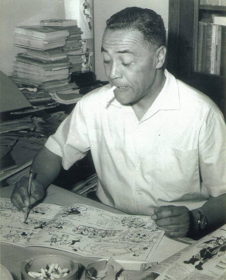 Fernand Van Horen was born in 1909 in Djokupunda, a town in the Belgian colony Congo, but spent most of his life in the Brussels area. His father worked for the Compagnie du Kasai, and his mother was a native Congolese, making him multiracial. He enrolled at the Academy of Brussels in 1926, where one of his teachers was the painter Anto Carte. An avid sportsman himself, Horn made his first caricatures of sportsmen for Le Soir in 1936. He remained a contributor to this Walloon newspaper for many decades to come. He sometimes signed his work with 'Horn', a contraction of his last name, or 'Jonko', a contraction of his birth town.