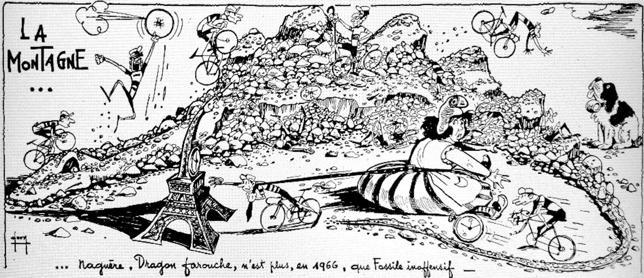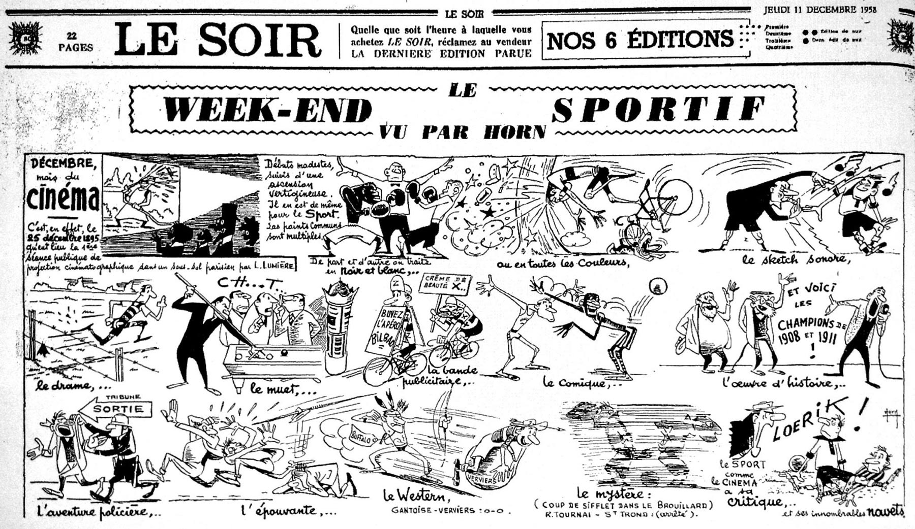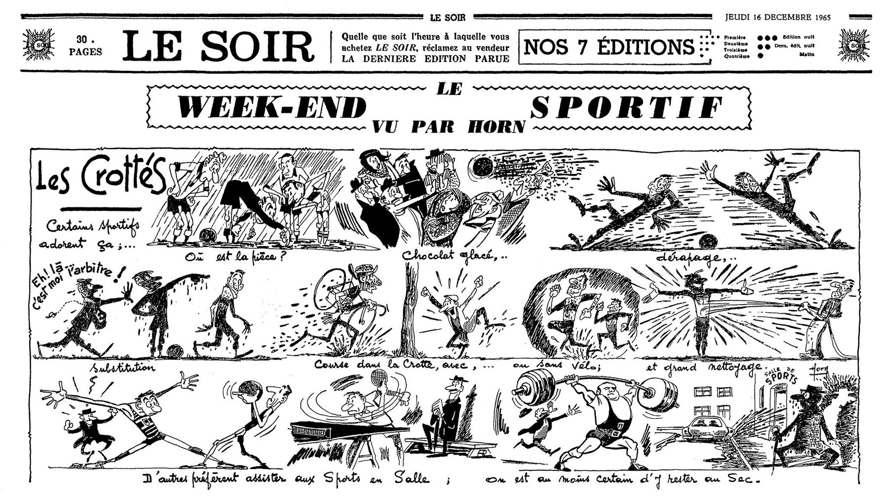 From December 1946 until 1978, Horn covered all types of sports in his section 'Le Week-End sportif', which appeared every Thursday on the last page of Le Soir. He became especially known for his humorous drawings of the Tour de France. Famous Belgian cyclists like Rik Van Steenbergen and Rik Van Looy, as well as soccer player Rik Coppens were often given guest roles. Later sections by Horn were 'Le Sport Souriant' (September 1978 - December 1982) and 'Il Ya 50 ans' (February 1972-April 1990). Horn also illustrated several serials, historical series and sports articles, not only for Le Soir, but also for Het Laatste Nieuws and Le Soir Illustré. Horn remained with Le Soir until 1990.