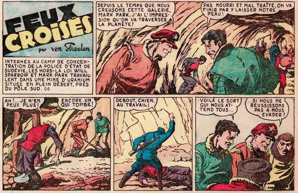 Throughout most of the 1940s, Van Straelen worked frequently for the Parisian publisher Marcel Daubin (S.E.P.I.A.). For several of the publisher's collections, he made new 16-page stories of the Italian aviation series and 'Aéroport Z' and especially 'Will Sparrow' ('Les Pirates du Ciel'). These series were originally drawn by the Italian artist Kurt Caesar and published in Italy in magazines like Audace, Topolino and Paperino during the 1930s. In French translation, they additionally ran in French-language magazines like Robinson, L'As and Spirou. While in Italy these series were later continued by artists like Aurelio Galleppini and Giovanni Benvenutti, the French publisher assigned local artists like Van Straelen to produce new stories. The most likely reason shall be that the World War II circumstances kept the publisher from acquiring the original material. In Daubin's collection Les Cahiers d'Ulysse, much of the original Kurt Caesar material was published, while Van Straelen is credited for the 'Aeroport Z' stories 'Terreur sur l'Île' (issue #20, 1942), 'Poursuite Sans Escale' (issue #23, 1942) and 'Jungle en Flammes' (Sélections Prouesses, 1943), as well as the 'Will Sparrow' story 'Le Fléau des Mers du Sud' (issue #30, 1942). Further French 'Aéroport Z' stories were drawn by Roger Melliès, as Van Straelen's main occupation became the 'Will Sparrow' adventures.